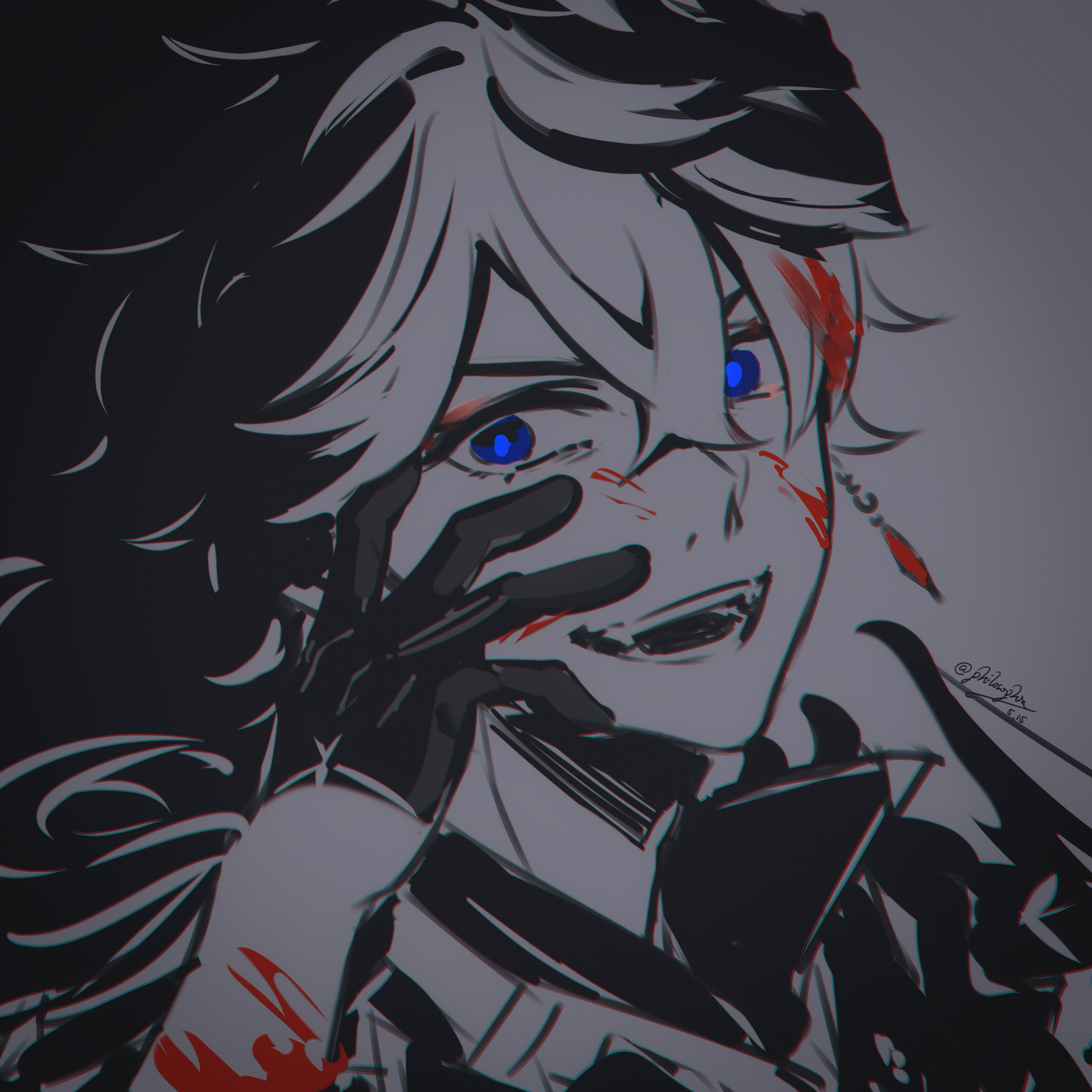 1boy blood blood_on_face blue_eyes commentary_request crossed_bangs double-parted_bangs earrings genshin_impact gloves greyscale hair_between_eyes hand_up highres jewelry looking_at_viewer male_focus monochrome open_mouth philosophia portrait short_hair single_earring smile solo spot_color tartaglia_(genshin_impact) two-tone_background