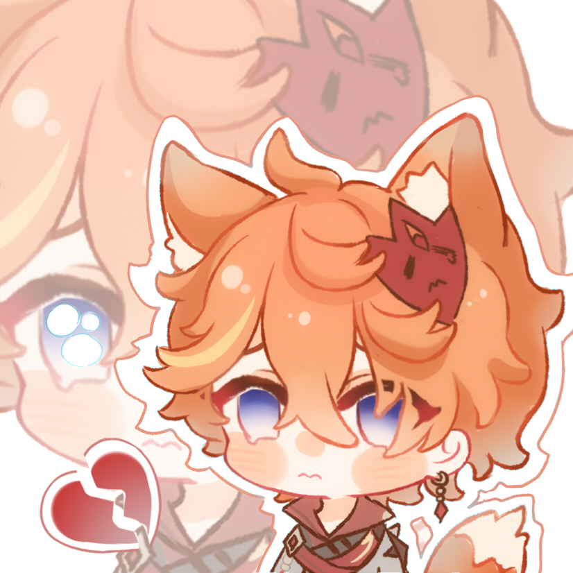 1boy animal_ear_fluff animal_ears blue_eyes blush_stickers broken_heart chibi chibi_only closed_mouth commentary_request double-parted_bangs earrings genshin_impact grey_shirt hair_between_eyes heart jewelry kemonomimi_mode male_focus orange_hair outline philosophia shirt short_hair single_earring tail tartaglia_(genshin_impact) tearing_up wavy_mouth white_outline zoom_layer