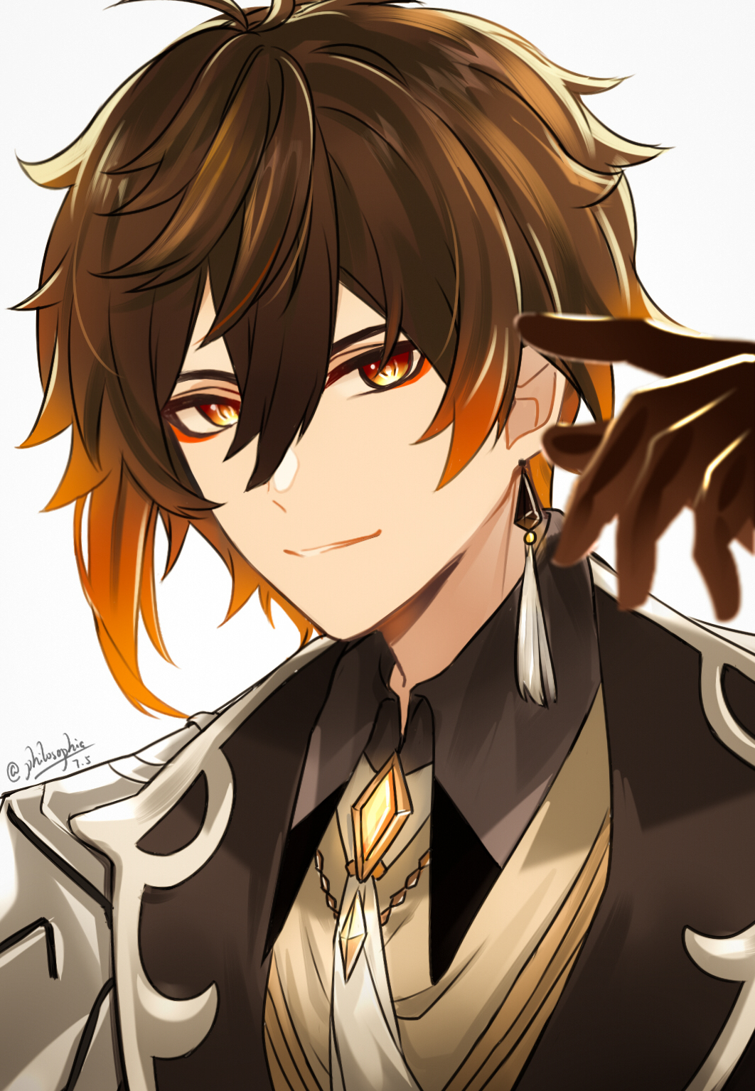 1boy brown_eyes brown_gloves brown_hair commentary double-parted_bangs earrings genshin_impact gloves hair_between_eyes hand_up highres jewelry looking_at_viewer male_focus parted_lips philosophia short_hair simple_background single_earring smile solo upper_body white_background zhongli_(genshin_impact)