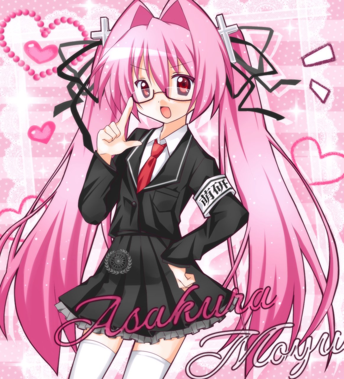 1girl asakura_moyu character_name collared_shirt commentary_request cross_hair_ornament glasses hair_intakes hair_ornament hair_ribbon hand_on_own_hip heart highres index_finger_raised jacket long_hair long_sleeves looking_at_viewer moeken mugi_(mugi44i) necktie open_mouth pink_background pink_hair pleated_skirt red_eyes ribbon school_uniform shirt skirt smile solo sparkle thighhighs twintails very_long_hair