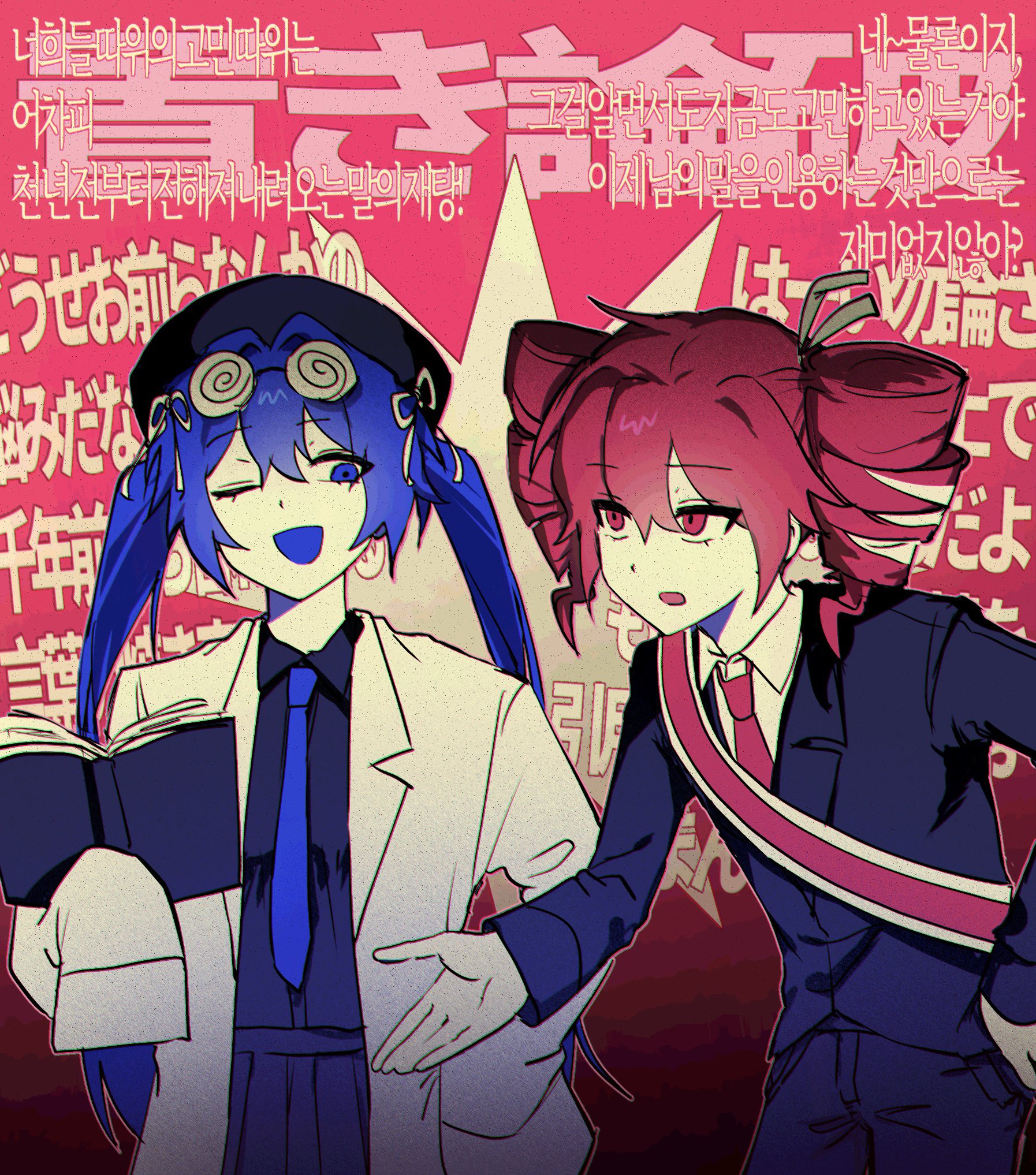 2girls bag beyond9r blue_eyes blue_hair commentary_request drill_hair highres kasane_teto kasane_teto_(sv) korean_text lab_coat multiple_girls necktie otomachi_una red_bag red_eyes red_hair red_necktie school_uniform shirt smile synthesizer_v twintails utau vocaloid white_shirt