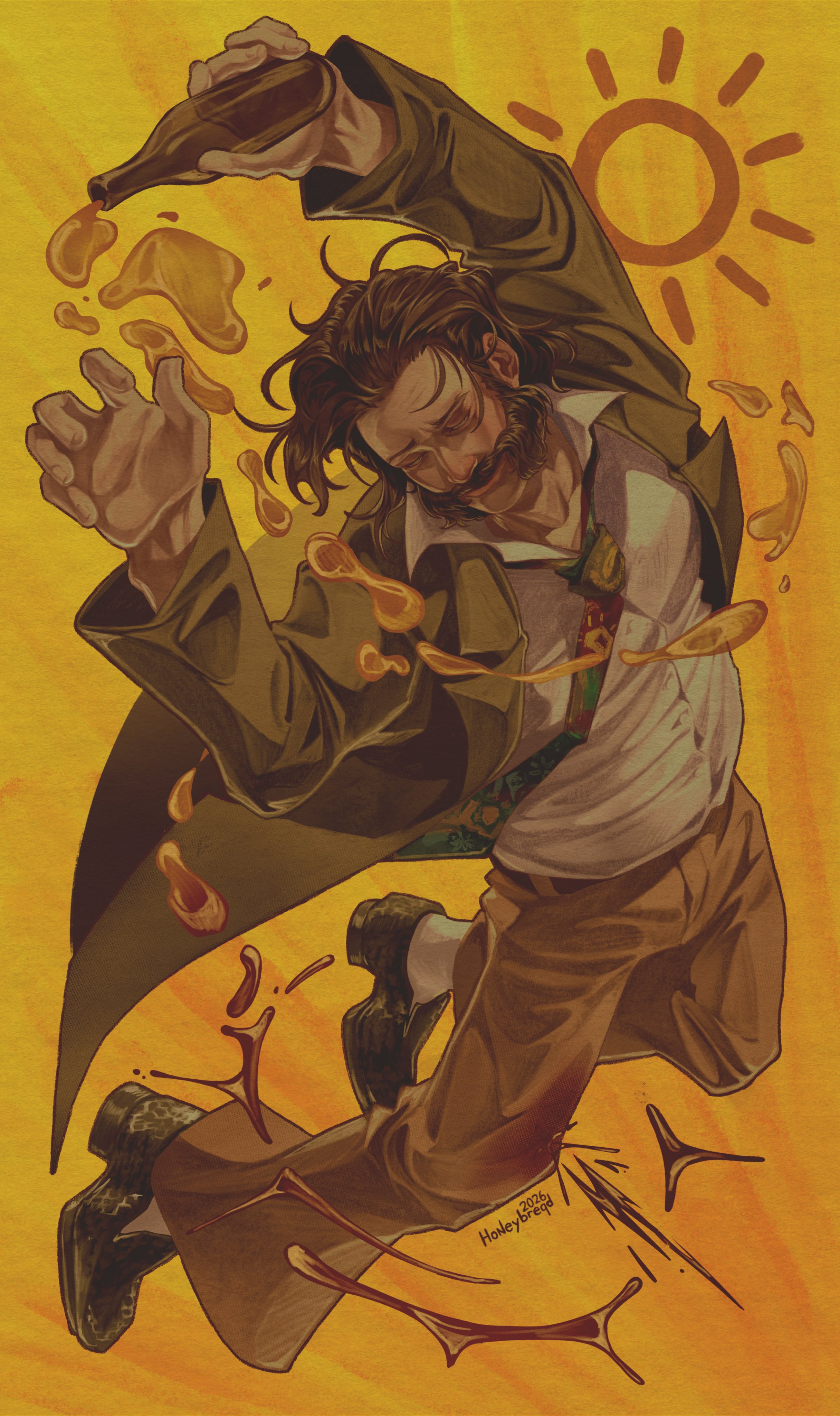1boy absurdres alcohol arms_up blazer bottle brown_hair closed_eyes collared_shirt disco_elysium facial_hair floating_liquid full_body green_jacket hair_slicked_back harry_du_bois highres holding holding_bottle horrific_necktie jacket madu_(honeybreqd) male_focus mullet mutton_chops necktie open_clothes open_jacket shirt solo swirl white_shirt