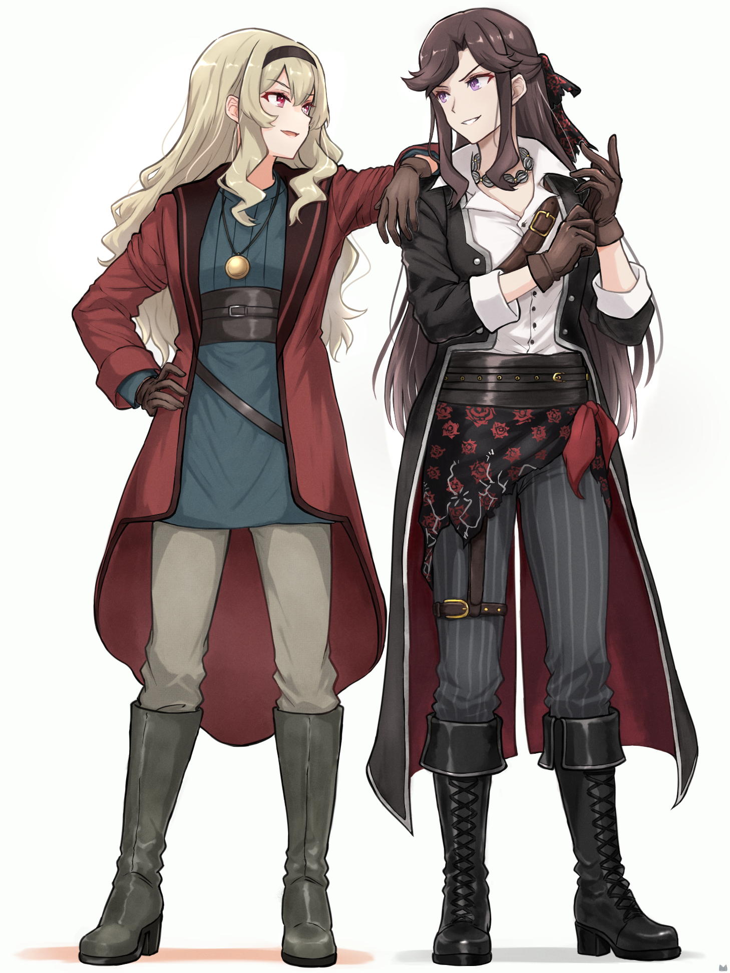 2girls adjusting_clothes adjusting_gloves arm_on_another's_shoulder belt belt_buckle black_belt black_boots black_coat black_hairband blonde_hair blue_shirt boots brown_belt brown_gloves brown_hair buckle buttons chibinekopan coat commentary_request eye_contact full_body gloves grey_pants grin hair_between_eyes hairband hand_on_own_hip hand_up hands_up high-waist_belt highres jewelry knee_boots lace-up_boots long_hair long_sleeves looking_at_another looking_to_the_side multiple_girls necklace official_alternate_costume open_clothes open_coat pants parted_bangs parted_lips pink_eyes purple_eyes red_coat red_ribbon ribbon saijo_claudine shirt shirt_tucked_in shoujo_kageki_revue_starlight shoulder_belt sidelocks simple_background smile standing striped_clothes striped_pants tendo_maya thigh_belt thigh_strap two-sided_coat two-sided_fabric v-shaped_eyebrows vertical-striped_clothes vertical-striped_pants very_long_hair white_background white_shirt