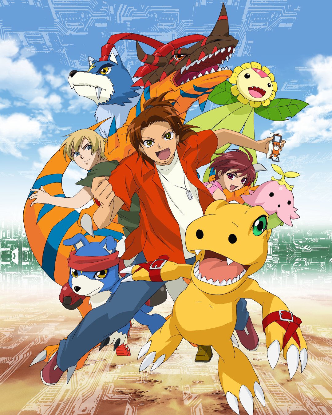1girl 2boys agumon_(digimon_savers) blonde_hair blue_eyes blue_pants brown_eyes brown_hair commentary_request daimon_masaru_(digimon_savers) digimon digimon_(creature) digimon_savers digivice_ic dinosaur dog evolutionary_line fangs fujieda_yoshino gaogamon gaomon geogreymon group_picture highres horns lalamon multiple_boys official_art pants pink_shirt red_shirt sharp_teeth shirt short_hair sunflowmon teeth textless_version touma_h._norstein white_shirt wolf