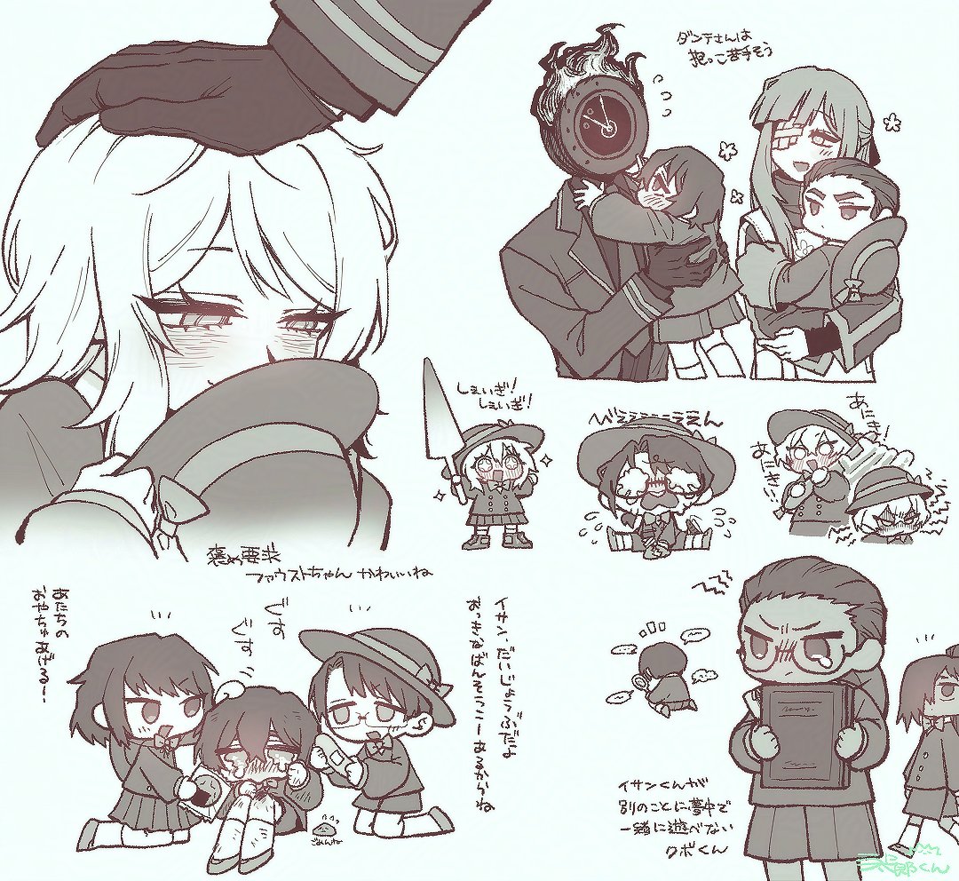 1other 4girls 6+boys aged_down aseah_(project_moon) bandaid blush bow bowtie closed_mouth commentary crying dante_(limbus_company) don_quixote_(project_moon) dongbaek_(project_moon) dongrang_(project_moon) food glasses gregor_(project_moon) greyscale gubo_(project_moon) happy hat hat_bow holding holding_mirror hug kindergarten_uniform limbus_company limbus_kindergarten_uniform meursault_(project_moon) mirror monochrome multiple_boys multiple_girls petting project_moon senbei short_hair sinclair_(project_moon) smile translation_request unitaroukun yi_sang_(project_moon) yuri_(project_moon)