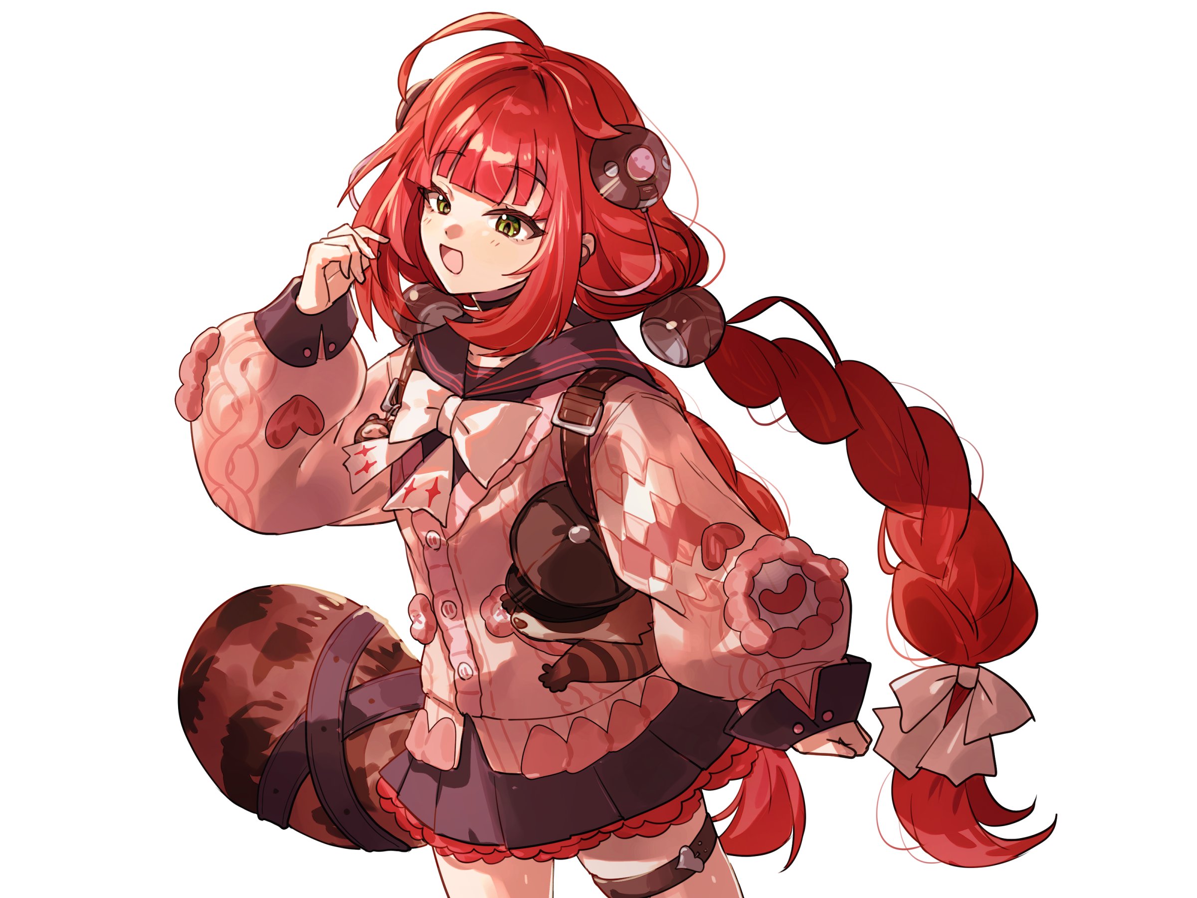 1girl black_sailor_collar blush braid braided_twintails cardigan chest_bow commentary_request green_eyes hair_ornament hand_up hearing_aid highres kamanosuke_(zenless_zone_zero) kanisakiclub long_hair looking_at_viewer open_mouth pink_cardigan raccoon red_hair sailor_collar simple_background solo sphere_hair_ornament tanuki ukinami_yuzuha white_background zenless_zone_zero