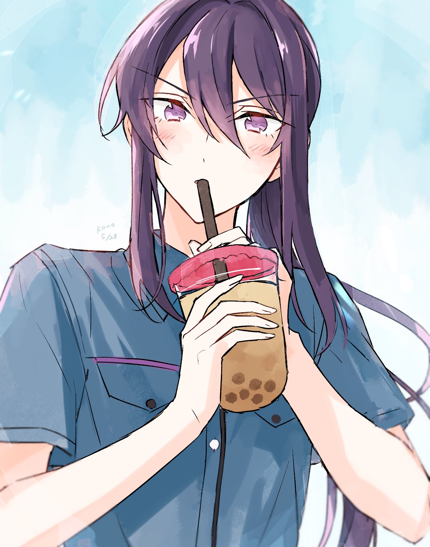 1boy blue_background blue_shirt blush bubble_tea commentary_request drink drinking drinking_straw ensemble_stars! gradient_background hair_between_eyes highres holding holding_drink holding_drinking_straw kanzaki_souma ko_no_ao long_hair looking_at_viewer male_focus parted_lips ponytail purple_eyes purple_hair shirt short_sleeves solo upper_body v-shaped_eyebrows