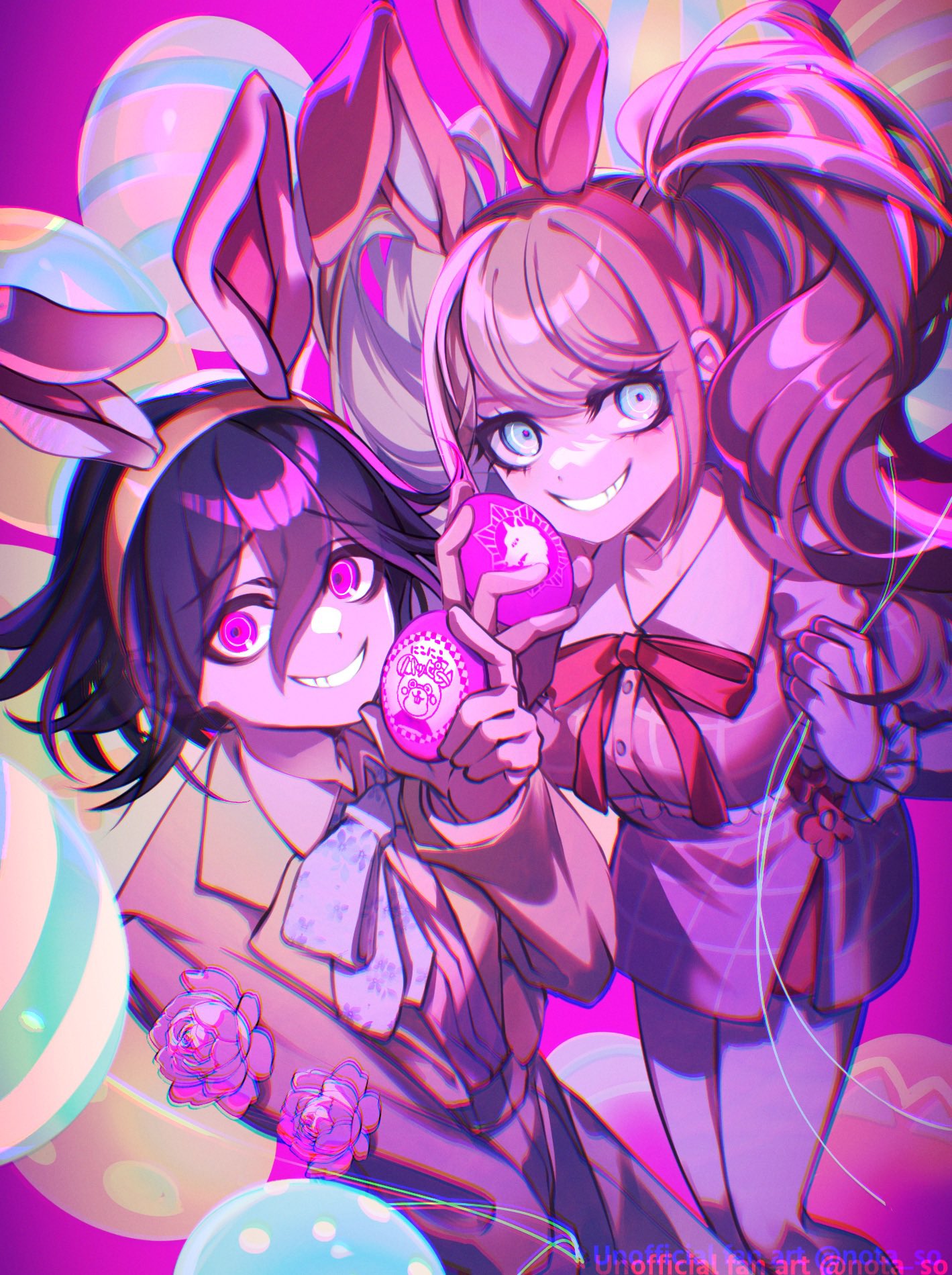 &{ID:13782753 CreatedAt:Fri Apr 03 10:30:10 -0500 2026 Score:3 Width:1419 Height:1899 MD5:c9ee31444b4eb731592656ce43fb2672 Directory:c9/ee Image:c9ee31444b4eb731592656ce43fb2672.jpg Rating:general Source:https://x.com/nota_so/status/2040009851217273092 Change:1775230210 Owner:danbooru CreatorID:6498 ParentID:0 Sample:1 PreviewHeight:350 PreviewWidth:261 Tags:1boy 1girl animal_ear_hairband animal_ears balloon big_hair blonde_hair blue_eyes blur_layer bow breasts chromatic_aberration collared_shirt commentary danganronpa:_trigger_happy_havoc danganronpa_(series) danganronpa_v3:_killing_harmony easter easter_egg egg enoshima_junko eyelashes fake_animal_ears flipped_hair from_above glowing glowing_eyes grin hairband highres holding holding_balloon long_hair long_sleeves looking_at_viewer nota_sayaka official_alternate_costume oma_kokichi pink_background pink_eyes pink_theme purple_hair rabbit_ear_hairband rabbit_ears red_bow shirt skirt smile standing teeth twintails very_long_hair watermark white_shirt Title: HasNotes:false HasComments:false FileURL:https://img2.gelbooru.com/images/c9/ee/c9ee31444b4eb731592656ce43fb2672.jpg PreviewURL:https://gelbooru.com/thumbnails/c9/ee/thumbnail_c9ee31444b4eb731592656ce43fb2672.jpg SampleURL:https://img2.gelbooru.com/samples/c9/ee/sample_c9ee31444b4eb731592656ce43fb2672.jpg SampleHeight:1138 SampleWidth:850 Status:active PostLocked:0 HasChildren:false IsVideo:false DisplayDate:03.04.2026 10:30}