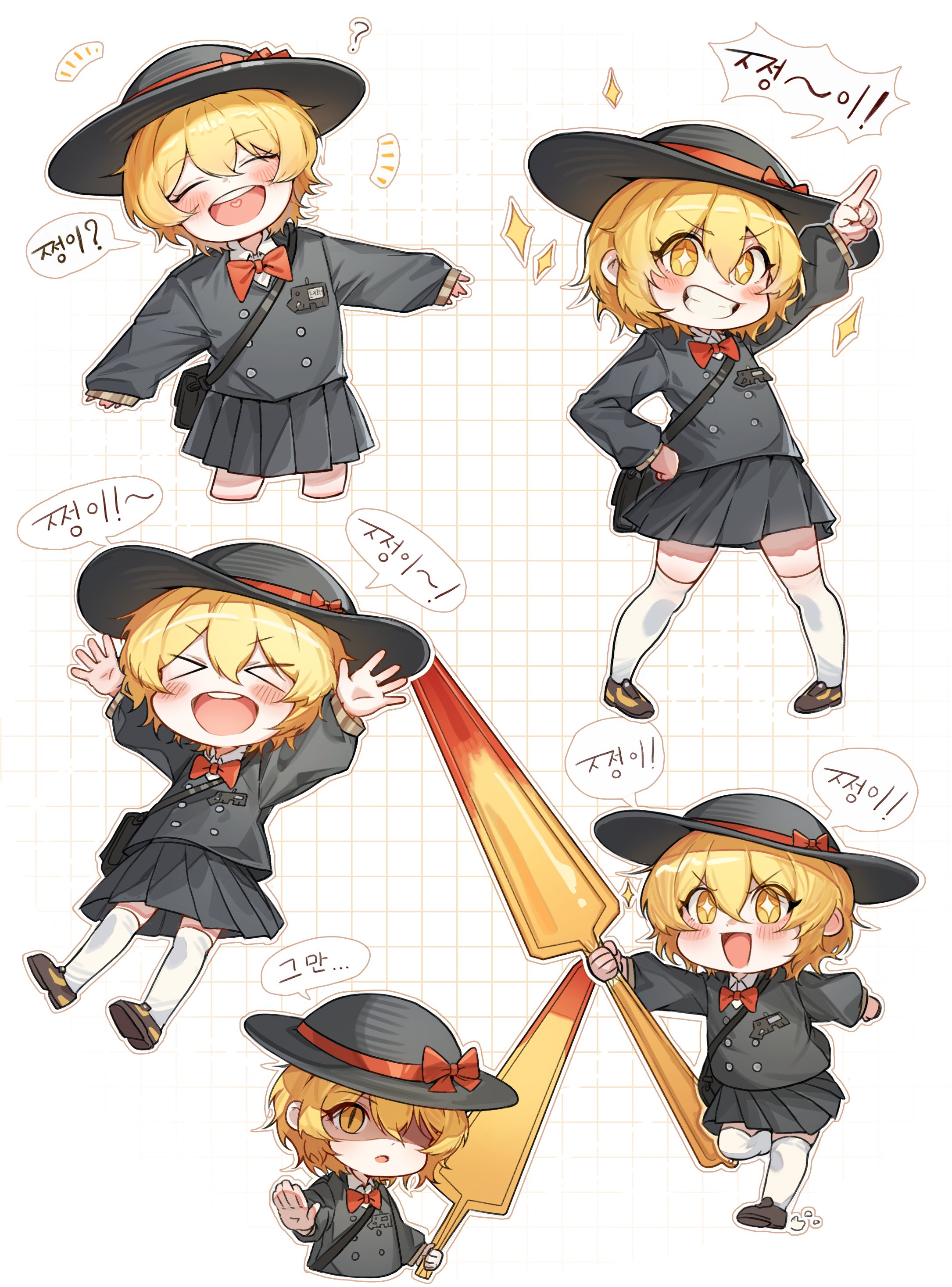 +_+ 1girl :d absurdres aged_down bag balloon black_bag black_hat black_skirt blonde_hair bow bowtie brown_shoes buttons child contrast_collar don_quixote_(project_moon) full_body grey_jacket hair_between_eyes hat hat_bow highres holding holding_polearm holding_weapon jacket jeehyung_seo kindergarten_uniform korean_text lance legs_up limbus_company limbus_kindergarten_uniform long_sleeves looking_at_viewer official_alternate_costume open_mouth orange_eyes polearm project_moon red_bow red_bowtie sancho_(project_moon) shoes short_hair shoulder_bag sidelocks simple_background skirt smile solo teeth upper_teeth_only v weapon white_background