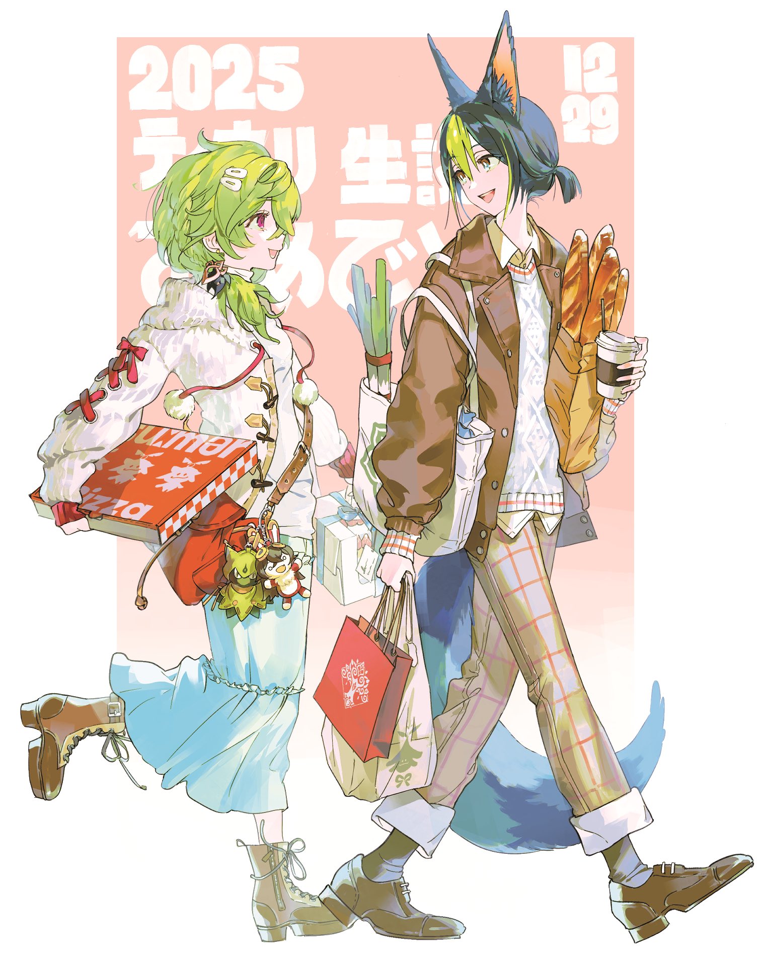 1boy 1girl alternate_costume animal_ear_fluff animal_ears bag bag_charm baguette baron_bunny_(genshin_impact) black_hair blue_skirt boots border box bread brown_boots brown_jacket brown_shoes charm_(object) collared_shirt collei_(genshin_impact) commentary_request contemporary cuilein-anbar_(genshin_impact) cup dated disposable_coffee_cup disposable_cup food fox_boy fox_ears fox_tail full_body genshin_impact green_eyes green_hair hair_ornament hair_over_shoulder hairclip highres holding holding_bag holding_box holding_cup jacket long_hair long_sleeves looking_at_another multicolored_eyes multicolored_hair open_mouth outside_border pants pink_background pizza_box plaid_clothes plaid_pants pochi_(ovio0p) pom_pom_(clothes) ponytail purple_eyes red_bag shirt shoes shopping_bag short_hair shoulder_bag simple_background skirt spring_onion streaked_hair sweater tail tighnari_(genshin_impact) translation_request two-tone_eyes untucked_shirt walking white_border white_sweater yellow_shirt