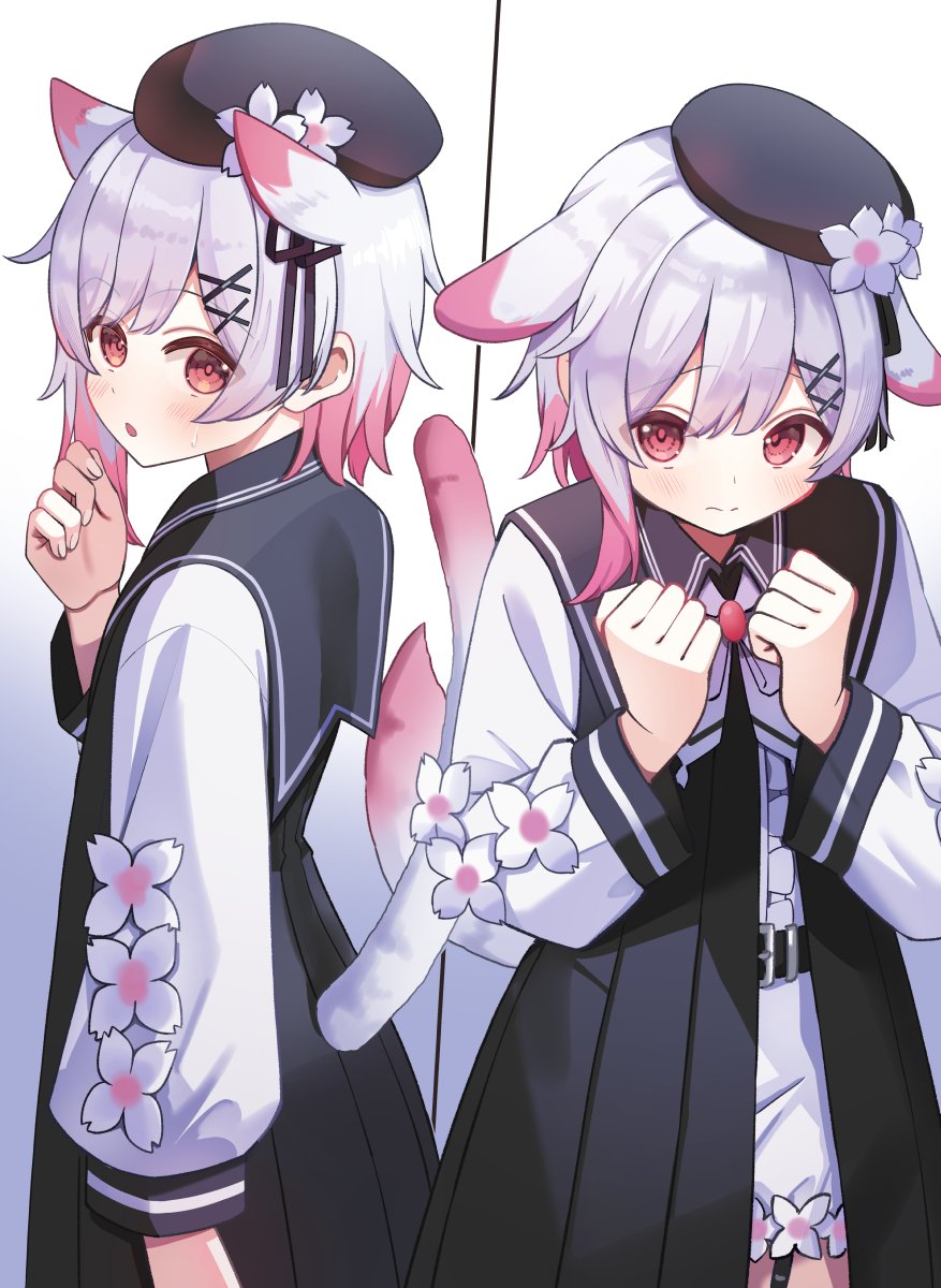 2girls :o animal_ears belt beret black_belt black_dress black_hat cat_ears cat_girl cat_tail clenched_hands closed_mouth commentary_request cowboy_shot dog_ears dog_girl dog_tail dress dual_persona ears_down flower hair_flower hair_ornament hand_up hands_up hat highres kemonomimi_mode long_sleeves looking_at_viewer looking_back mahou_shoujo_no_majo_saiban matsubara_tsuyoshi multicolored_hair multiple_girls neck_ribbon pink_eyes pink_hair ribbon sakuraba_ema short_hair shorts standing tail white_hair white_ribbon white_shorts x_hair_ornament