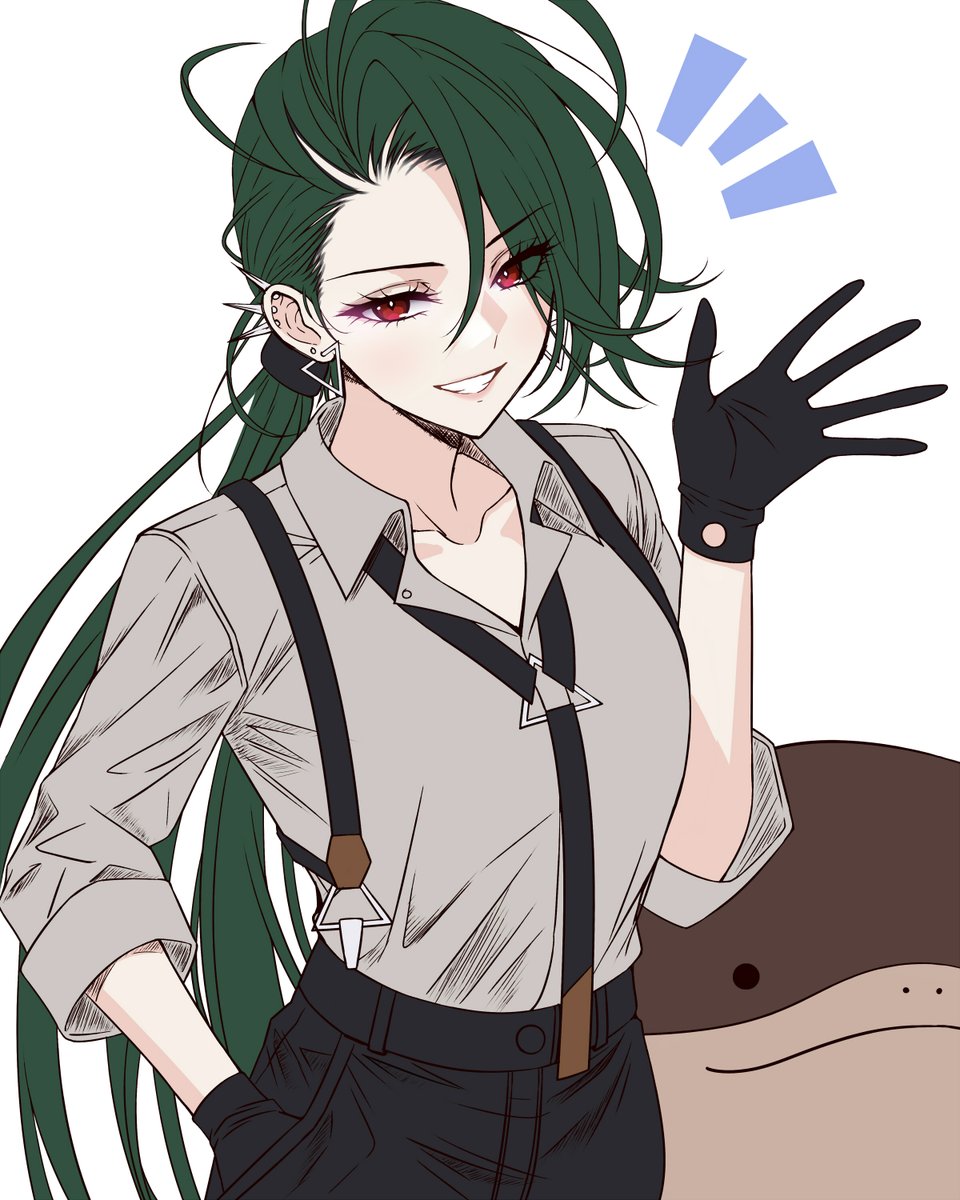 1girl ^^^ clodsire collarbone earrings gloves green_hair grin hand_in_pocket jewelry long_hair maximum_pamyu multiple_piercings nintendo pokemon pokemon_scarlet_and_violet ponytail red_eyes rika_(pokemon) smile solo suspenders upper_body waving white_background