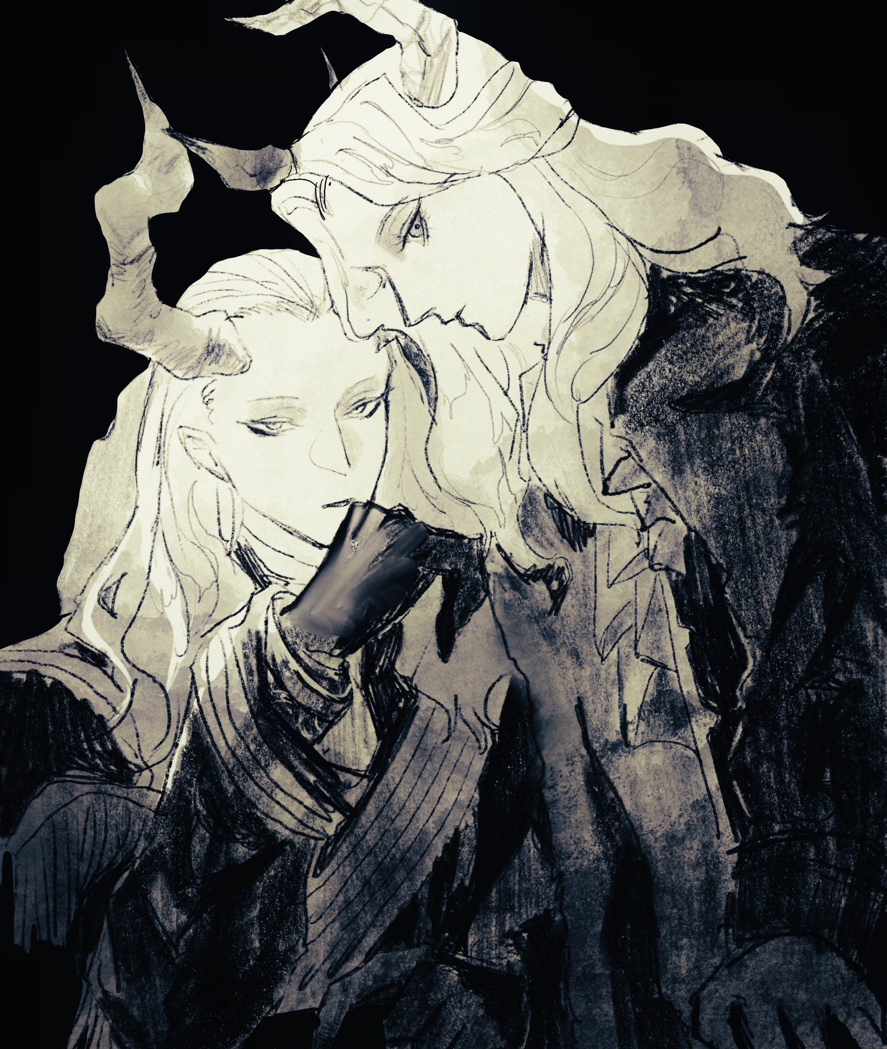 2boys closed_mouth coat commentary_request demon demon_boy demon_horns gloves greyscale highres horns kijihata111 large_horns long_hair lugner_(sousou_no_frieren) macht_(sousou_no_frieren) monochrome multiple_boys sousou_no_frieren