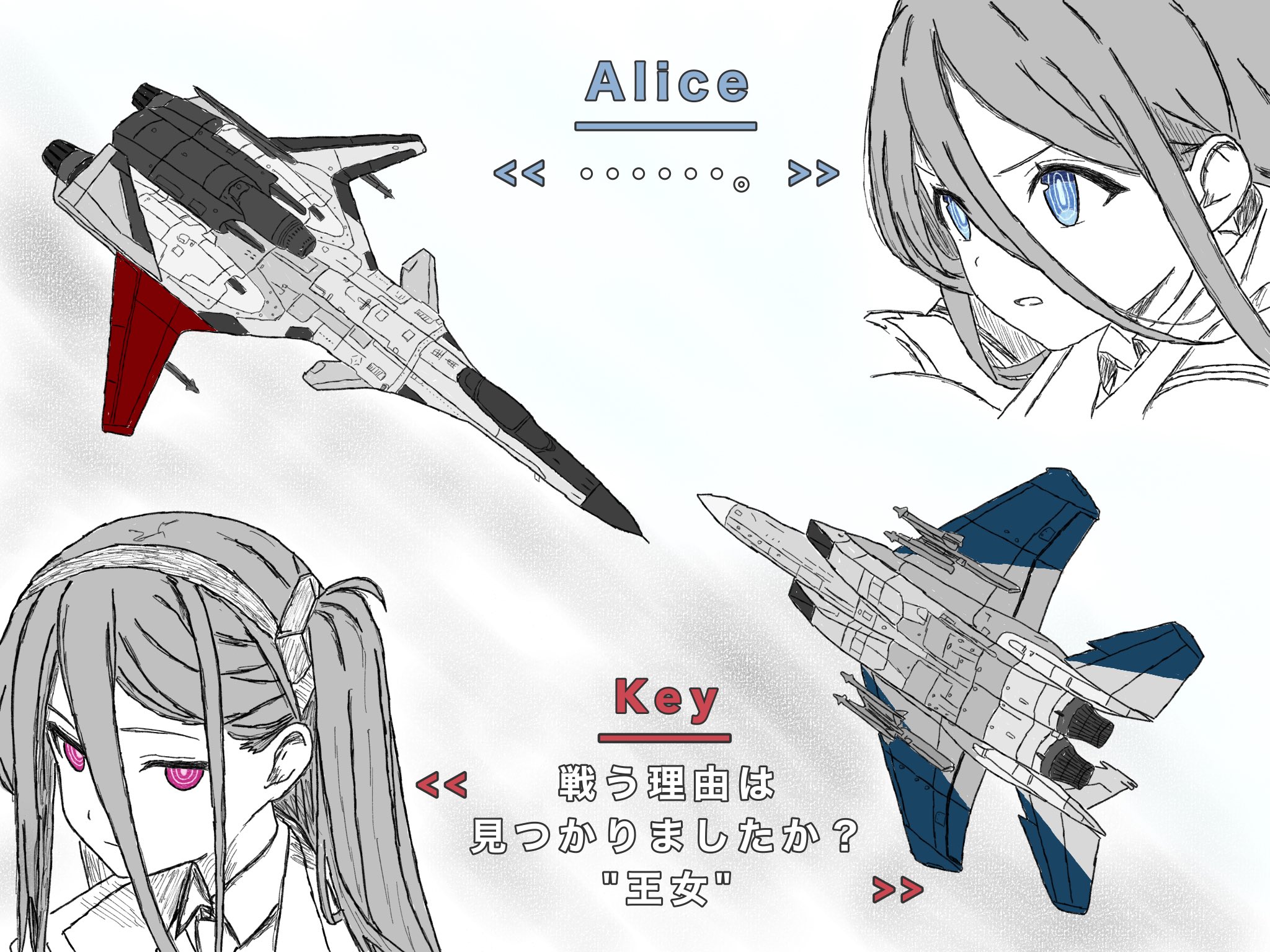 2girls ace_combat ace_combat_zero adfx-02_morgan aerial_battle aircraft airplane aris_(blue_archive) battle blue_archive blue_eyes cipher_(ace_combat) commentary_request dogfight f-15_eagle fighter_jet hair_between_eyes highres kei_(blue_archive) larry_foulke limited_palette long_hair long_hair_between_eyes military_vehicle multiple_girls purple_eyes side_ponytail tomatama014 translation_request