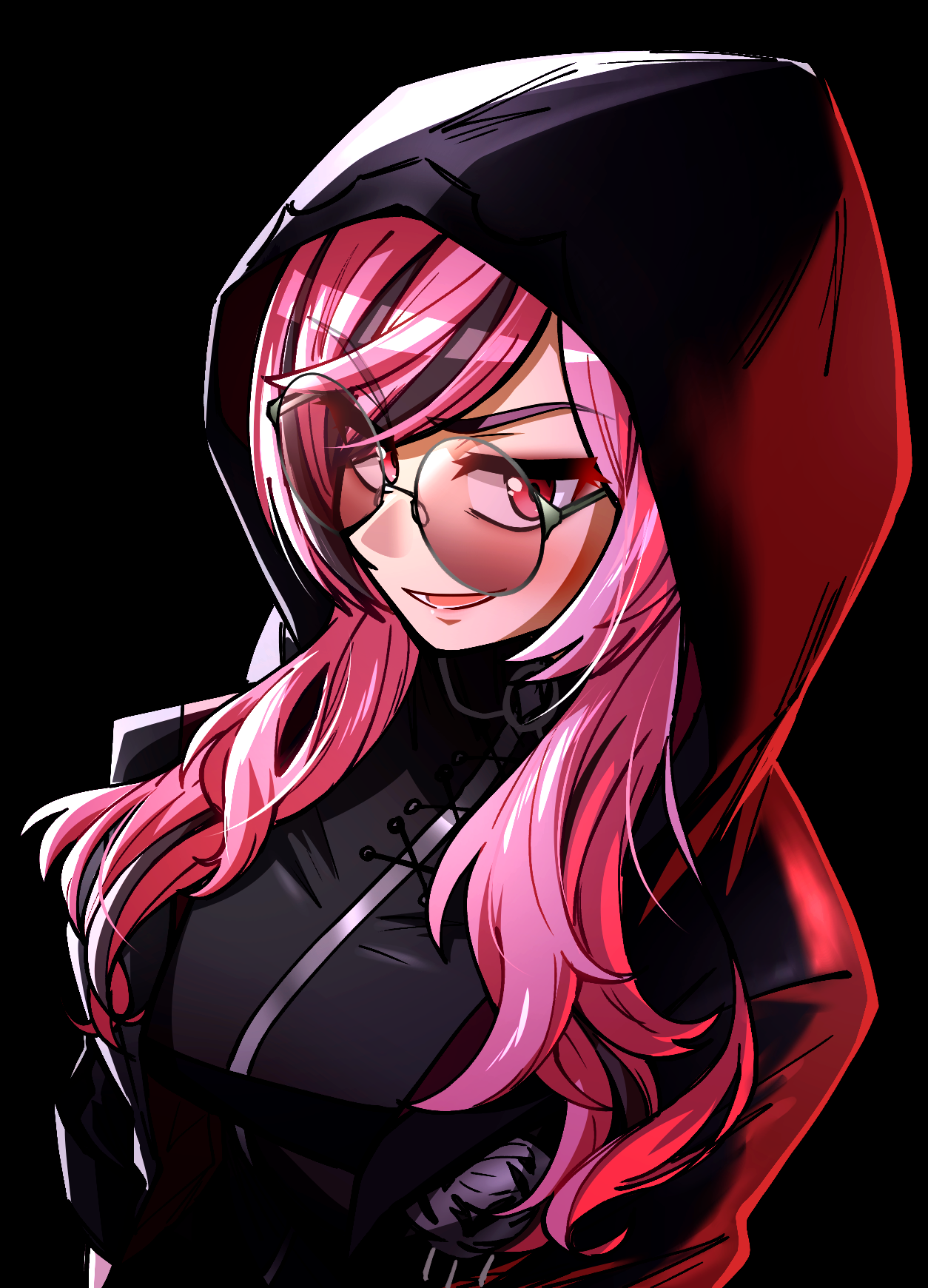 1girl black_hood black_jacket black_streaks ddolbang highres hololive hololive_english jacket long_sidelocks looking_at_viewer mori_calliope mori_calliope_(ferrywoman) multicolored_hair official_alternate_costume official_alternate_hairstyle open_mouth pink_hair red_eyes round_eyewear sidelocks streaked_hair virtual_youtuber