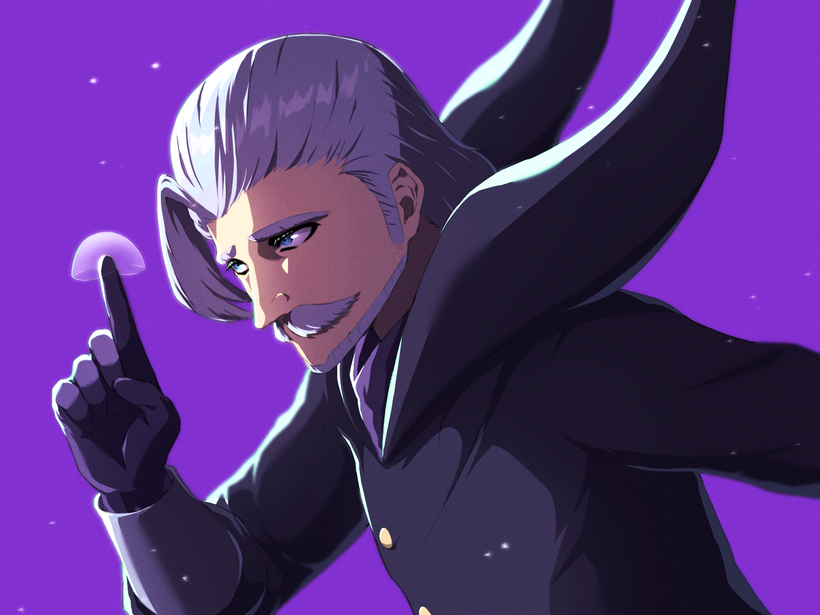 1boy beard black_gloves black_suit blue_eyes boku_no_hero_academia commentary_request facial_hair formal_clothes gentle_criminal gloves grey_hair highres mature_male medium_hair mustache purple_background re_d2929 sideburns solo suit upper_body
