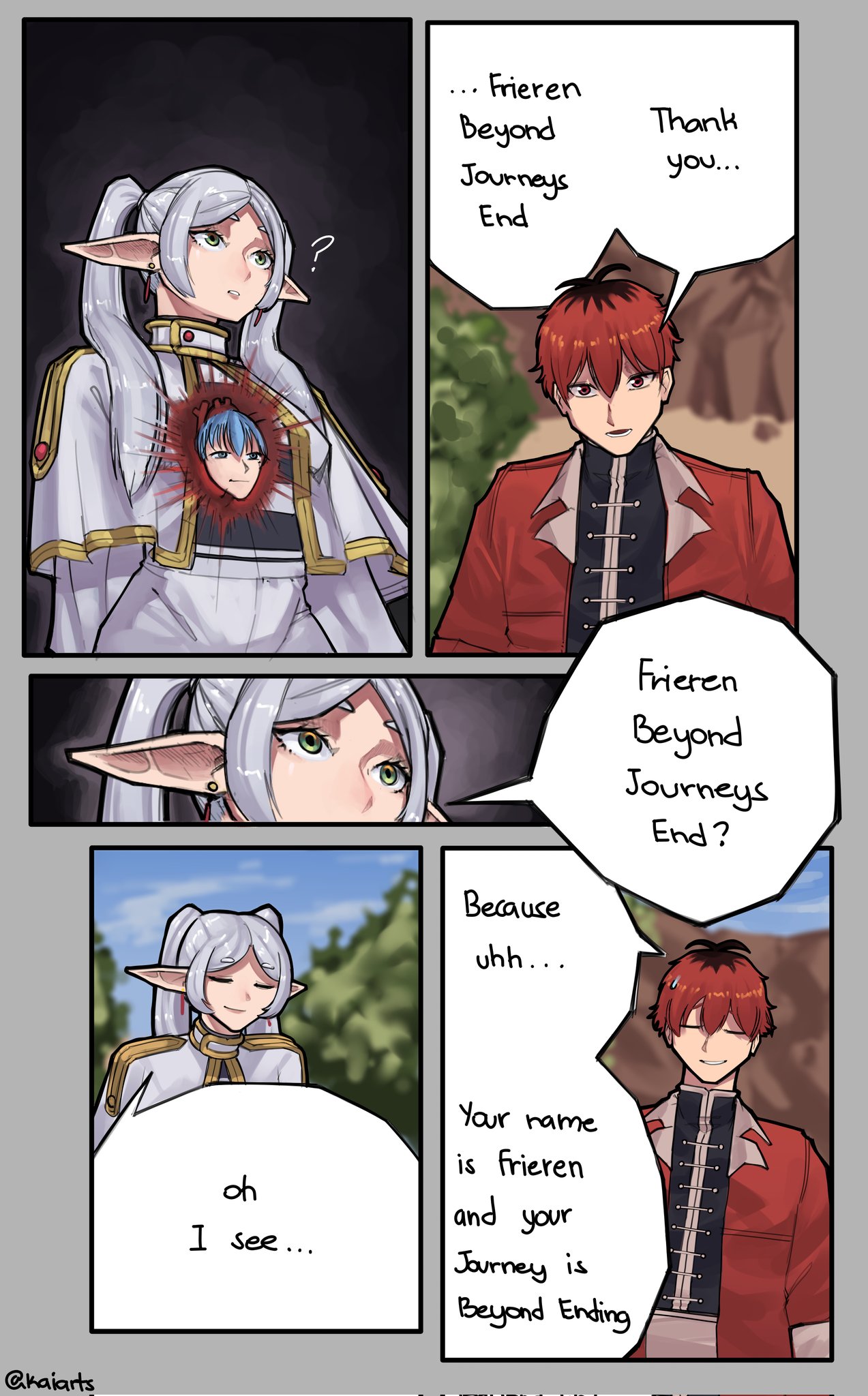 1boy 1girl closed_eyes closed_mouth dress earrings elf english_text frieren green_eyes highres himmel_(sousou_no_frieren) jacket jewelry kaiarts meme open_mouth pointy_ears red_eyes red_hair red_jacket sousou_no_frieren speech_bubble stark_(sousou_no_frieren) teardrop_earrings thank_you_chainsaw_man_(meme) twintails white_dress