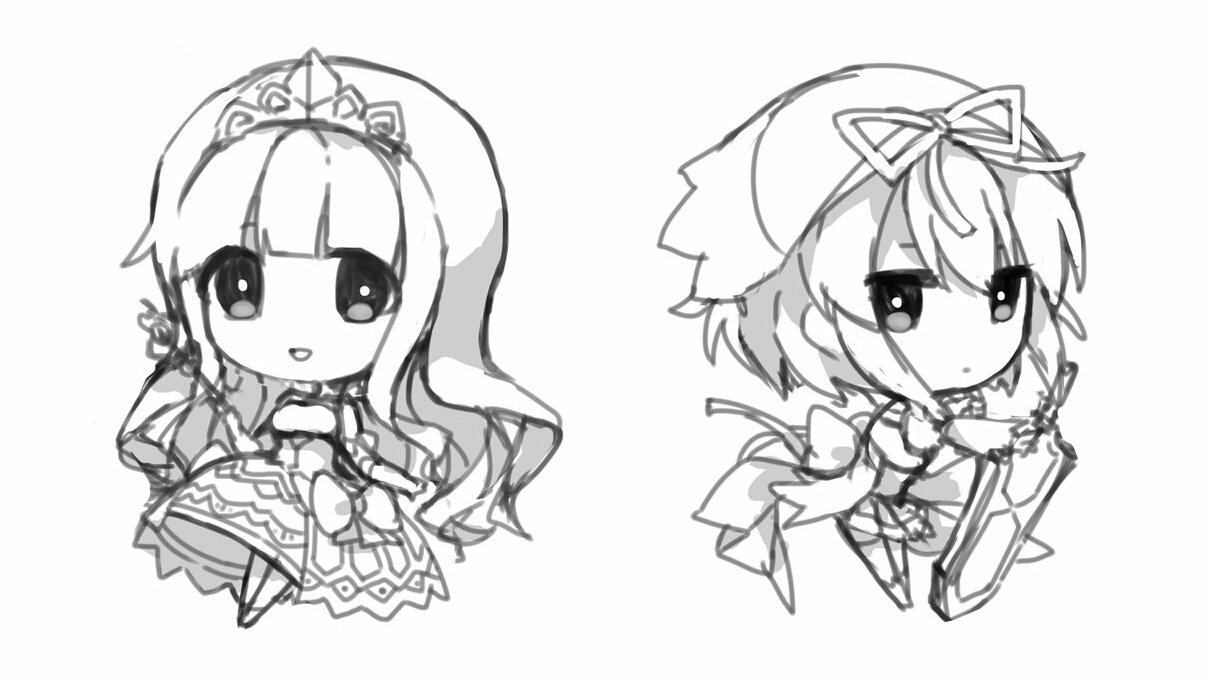 2girls az_9649 breasts bright_pupils chibi chibi_only cinderella_(grimms_notes) cinderella_(original)_(grimms_notes) closed_mouth commentary dress gloves greyscale grimms_notes hair_between_eyes hand_up holding holding_sword holding_wand holding_weapon la_belle_the_beauty_(grimms_notes) la_belle_the_beauty_(original)_(grimms_notes) looking_at_viewer monochrome multiple_girls parted_lips ribbon simple_background smile sword tiara untranslatable_commentary wand weapon white_background