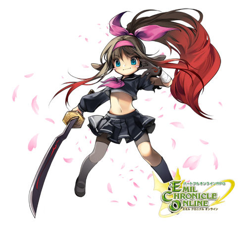 1girl animal_ears bandages bandana black_gloves black_serafuku blue_eyes blue_socks blush_stickers bow brown_hair cherry_blossoms copyright_logo dog_ears emil_chronicle_online gloves gradient_hair hair_bow holding holding_sword holding_weapon logo long_sidelocks looking_at_viewer lowres multicolored_hair navel neckerchief official_art pink_bandana pink_neckerchief pleated_skirt ponytail red_hair sarashi school_uniform serafuku shoes shugoma_uzuki sidelocks single_glove skirt socks solo sword uwabaki weapon white_background