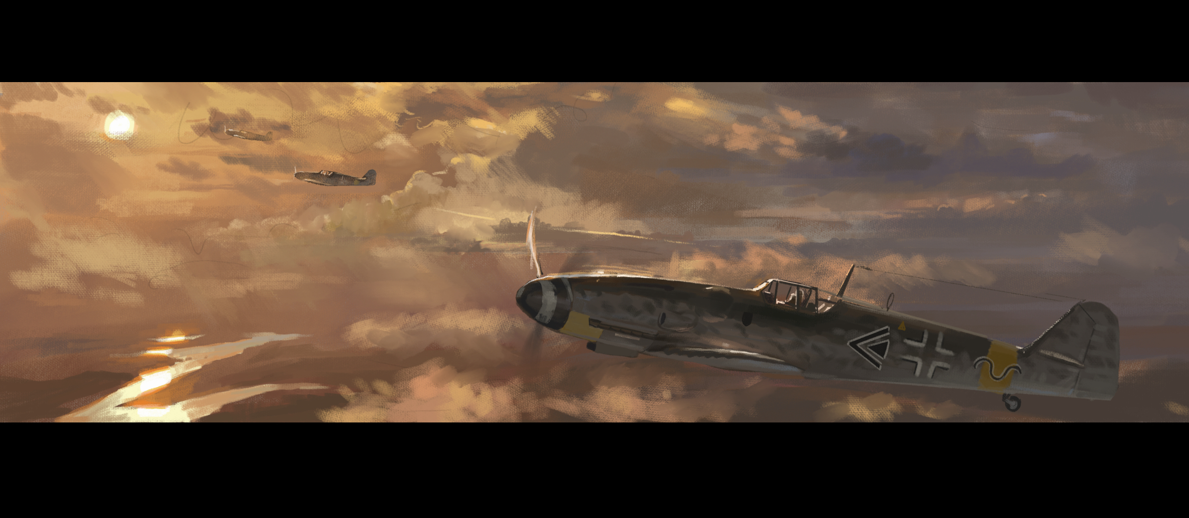 aircraft airplane balkenkreuz bf_109 cloud commentary cotact147 cross flying from_side high_up highres letterboxed luftwaffe military military_vehicle no_humans orange_sky original outdoors propeller_fighter river scenery sky sunset untranslatable_commentary vehicle_focus world_war_ii