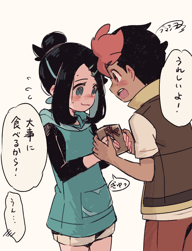 1boy 1girl black_hair black_shirt blush brown_vest closed_mouth commentary_request flying_sweatdrops hair_ornament hairclip hetero holding_hands hood hood_down hooded_vest hoodie liko_(pokemon) medium_hair multicolored_hair nervous_smile nintendo pokemon pokemon_(anime) pokemon_horizons rechain ringed_eyes roy_(pokemon) shirt short_sleeves shorts sidelocks smile speech_bubble sweat t-shirt translation_request two-tone_hair vest white_shirt