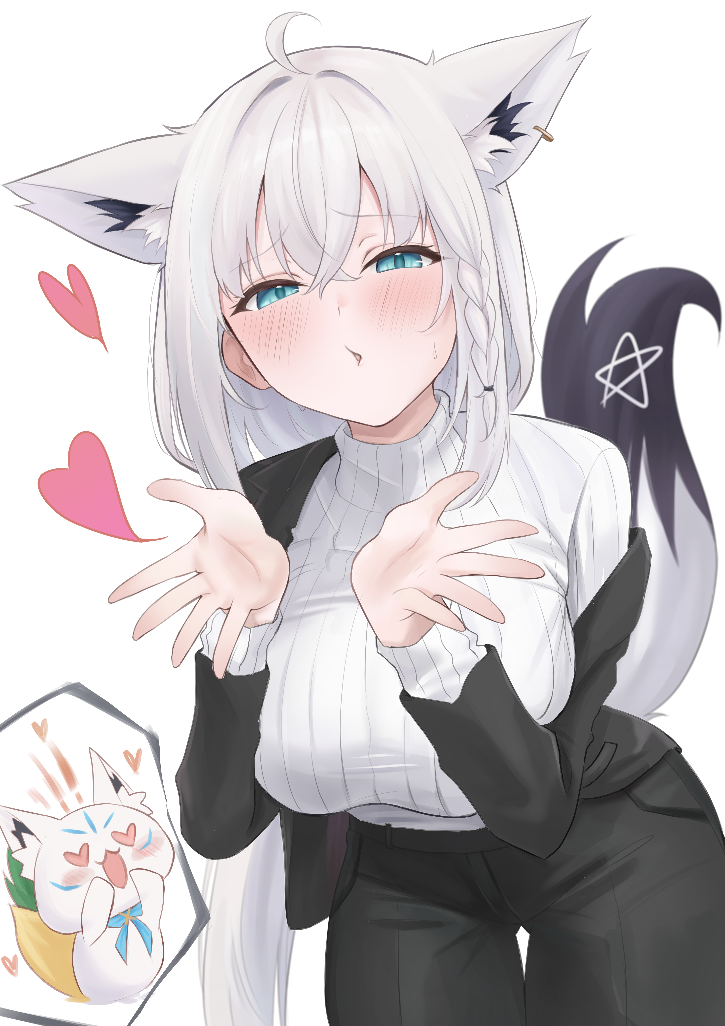 ! !! 1girl absurdres ahoge alternate_breast_size_(larger) alternate_costume animal_ear_fluff animal_ears black_jacket black_pants black_tail blowing_kiss blue_eyes blush braid breasts commentary_request earrings fox_ears fox_girl fox_tail heart highres hololive jacket jewelry large_breasts leaning_forward long_hair long_sleeves looking_at_viewer open_clothes open_jacket pants pentagram ribbed_sweater shirakami_fubuki simple_background single_braid single_earring single_off_shoulder solo sukonbu_(shirakami_fubuki) sweatdrop sweater tail thigh_gap tks_rkgk turtleneck turtleneck_sweater two-tone_tail very_long_hair virtual_youtuber white_background white_hair white_sweater white_tail