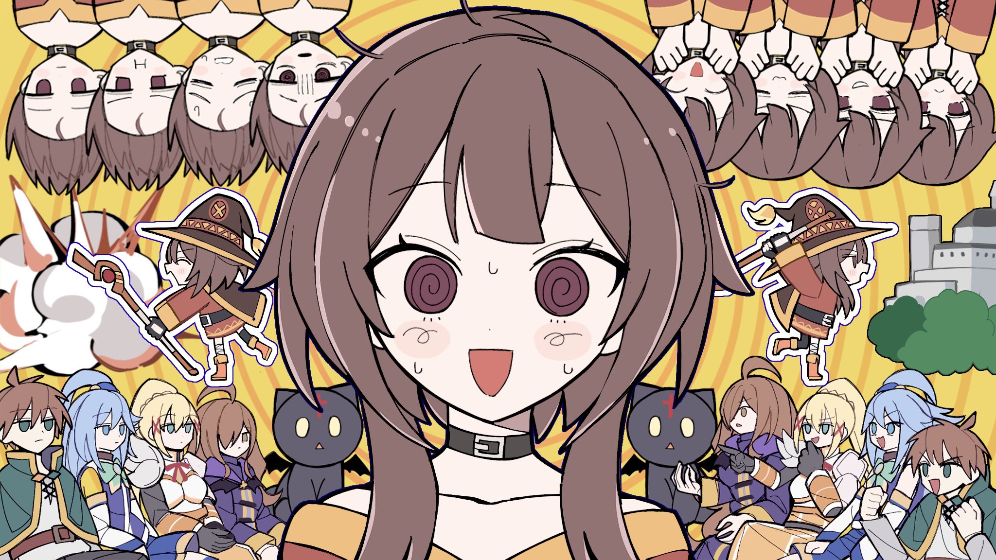 1boy 4girls :d ahoge animal aqua_(konosuba) armor black_gloves blonde_hair blue_hair bow bowtie braid brown_hair bush castle cat chomusuke commentary_request darkness_(konosuba) explosion fingerless_gloves gloves green_bow green_bowtie highres holding holding_staff kono_subarashii_sekai_ni_shukufuku_wo! long_hair looking_at_viewer megumin multiple_girls open_mouth ponytail satou_kazuma short_hair skmr_neo smile staff wings wiz_(konosuba) yellow_background