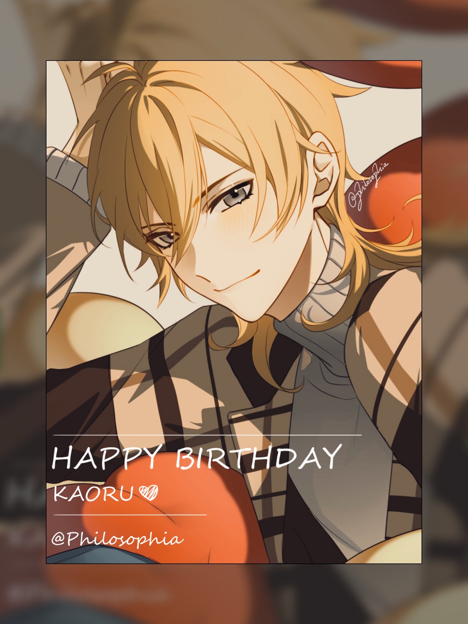 1boy arm_up blonde_hair border brown_jacket character_name closed_mouth commentary ensemble_stars! frosted_border grey_eyes grey_shirt hair_between_eyes hakaze_kaoru happy_birthday heart highres jacket looking_at_viewer male_focus medium_hair philosophia shirt smile solo turtleneck turtleneck_shirt upper_body