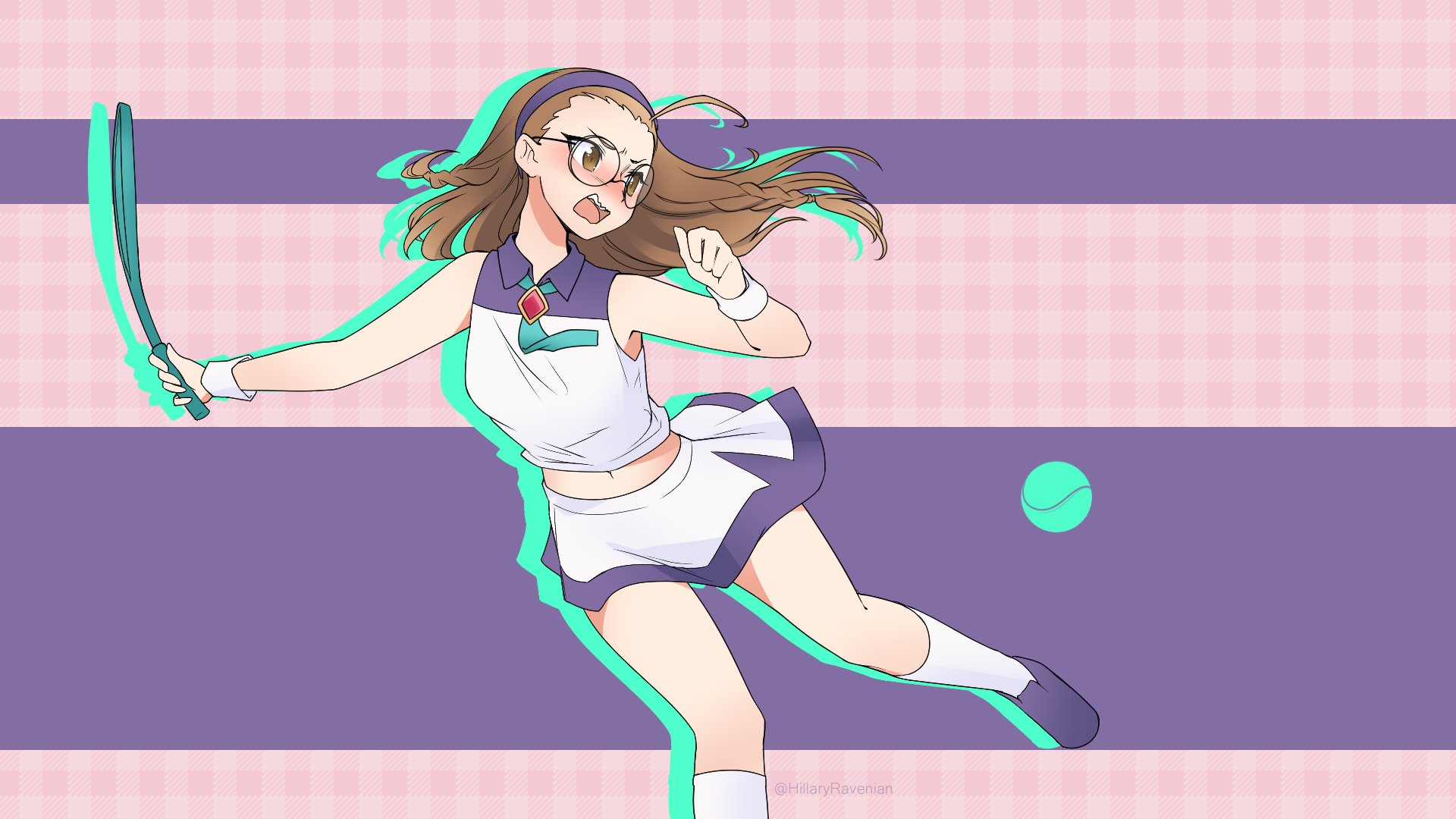 1girl ball blue_necktie braid brown_eyes brown_hair commentary drop_shadow english_commentary foot_out_of_frame glasses hairband highres hillaryravenian kneehighs long_hair magic_the_gandhi midriff miniskirt navel necktie open_mouth playing_sports purple_hairband purple_shoes racket rance_(series) round_eyewear shirt shoes skirt sleeveless sleeveless_shirt socks solo sportswear standing standing_on_one_leg teeth tennis tennis_ball tennis_racket tennis_uniform twin_braids upper_teeth_only white_shirt white_skirt white_socks