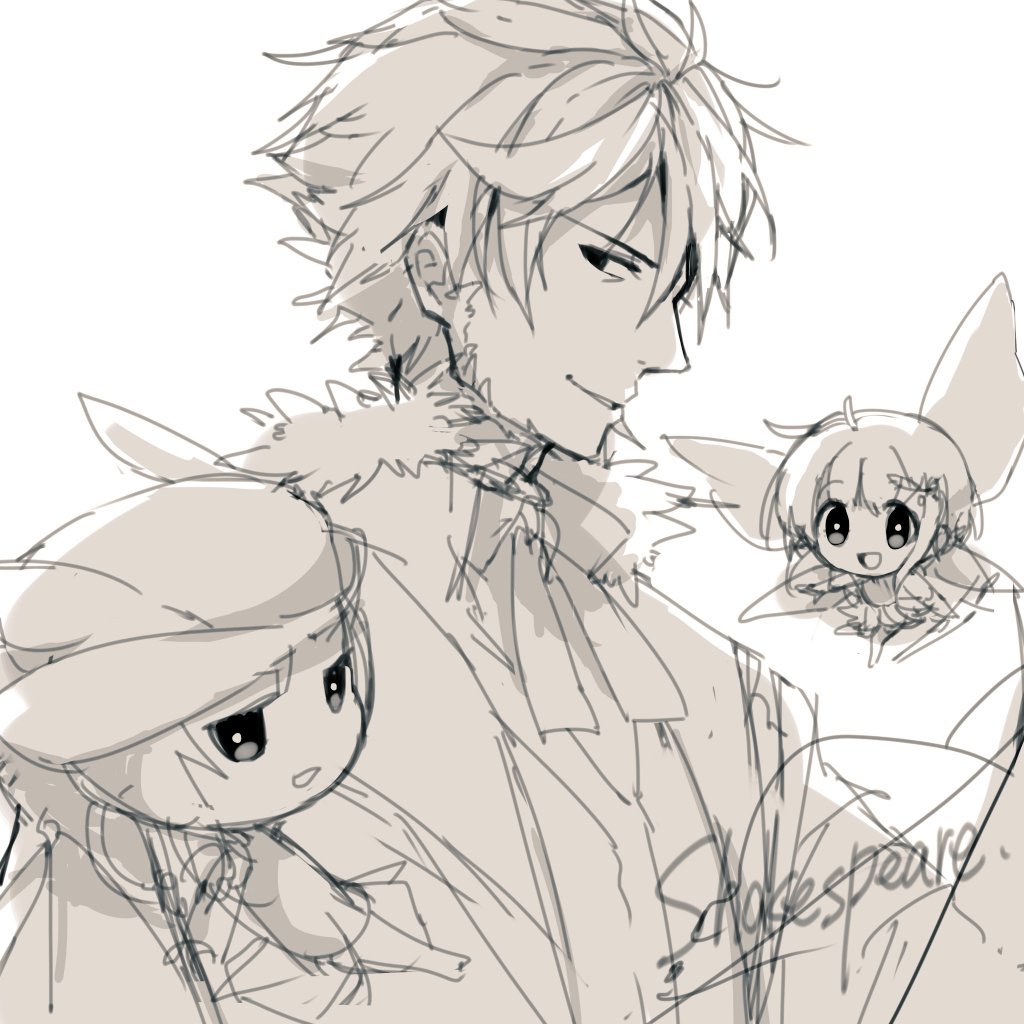1girl 2boys animal_ears az_9649 beard character_name chibi donkey_ears facial_hair fairy_wings fur_trim greyscale grimms_notes hat looking_at_viewer mini_person miniboy minigirl monochrome multiple_boys neck_ribbon nick_bottom_(grimms_notes) nick_bottom_(original)_(grimms_notes) parted_lips profile puck_(grimms_notes) puck_(original)_(grimms_notes) ribbon short_hair simple_background sketch smile spiked_hair teeth upper_body white_background william_shakespeare_(grimms_notes) william_shakespeare_(original)_(grimms_notes) wings