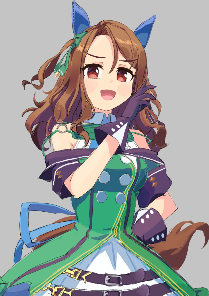 1girl animal_ears bare_shoulders black_gloves blush bow breasts brown_hair buttons commentary_request double-breasted dress ear_bow ear_covers ear_ribbon gloves green_bow green_dress horse_ears horse_girl horse_tail king_halo_(king_of_emeralds)_(umamusume) king_halo_(umamusume) long_hair looking_at_viewer off-shoulder_dress off_shoulder ojou-sama_pose open_mouth red_eyes ryooo simple_background smile solo tail umamusume