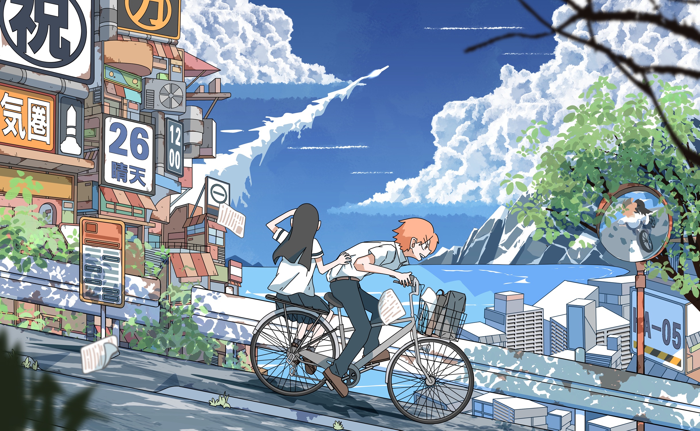 1boy 1girl bicycle black_hair blue_sky blurry blurry_foreground building city day highres mountain ocean orange_hair original outdoors paper riding riding_bicycle rokuban_(6thavenue) scenery sign sky slope summer traffic_mirror tree