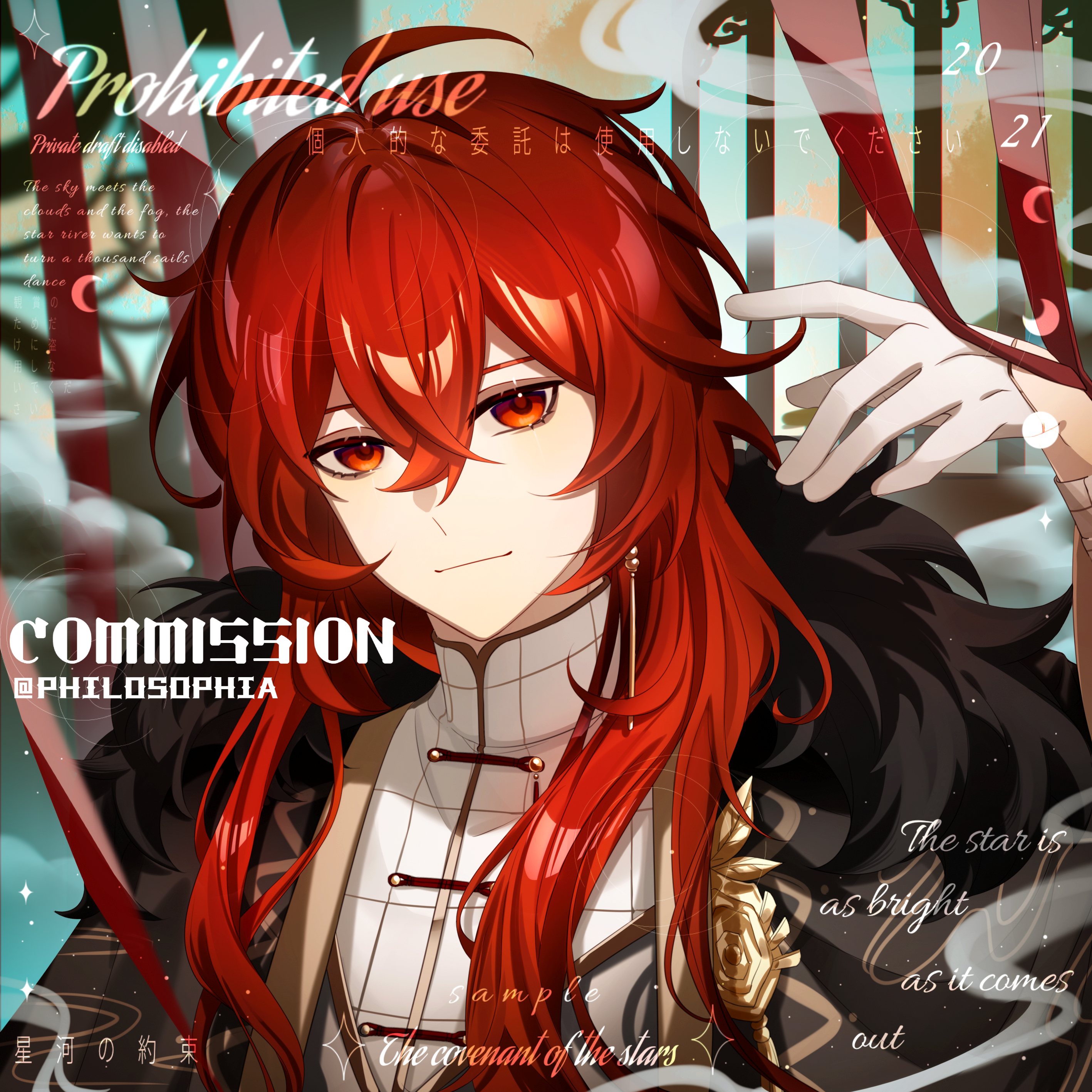 1boy absurdres antenna_hair black_coat changpao chinese_clothes closed_mouth coat commentary_request commission crossed_bangs diluc_(genshin_impact) double-parted_bangs fur-trimmed_coat fur_trim genshin_impact gloves hair_between_eyes hand_up highres long_hair looking_at_viewer male_focus philosophia red_eyes red_hair smile solo upper_body watermark white_gloves
