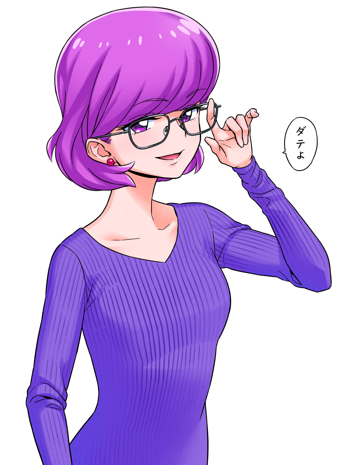 1girl adjusting_eyewear alternate_hair_length_(shorter) anime_coloring bespectacled black-framed_eyewear blunt_bangs collarbone commentary_request earrings eyelashes glasses hand_on_eyewear happy highres jewelry kirakira_precure_a_la_mode kotozume_yukari long_sleeves looking_at_viewer open_mouth precure purple_eyes purple_hair purple_sweater shirai_keita short_hair simple_background smile solo speech_bubble sphere_earrings sweater translation_request upper_body v-neck white_background