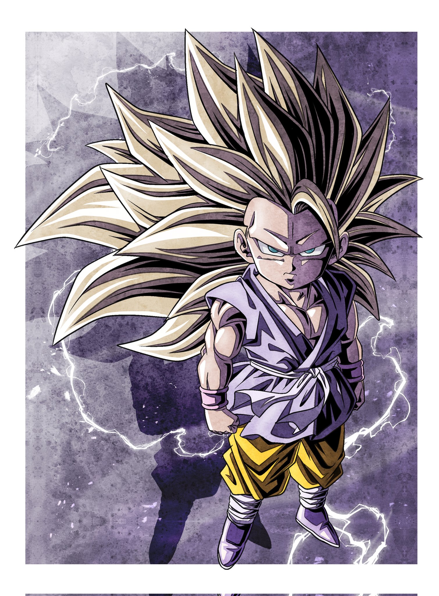 1boy blonde_hair blue_tunic border child commentary_request corrupted_twitter_file dragon_ball dragon_ball_gt electricity full_body green_eyes highres long_hair male_focus muscular muscular_male no_eyebrows pants shadow solo son_goku spiked_hair super_saiyan super_saiyan_3 tunic ushi_(akabec0) white_border yellow_pants