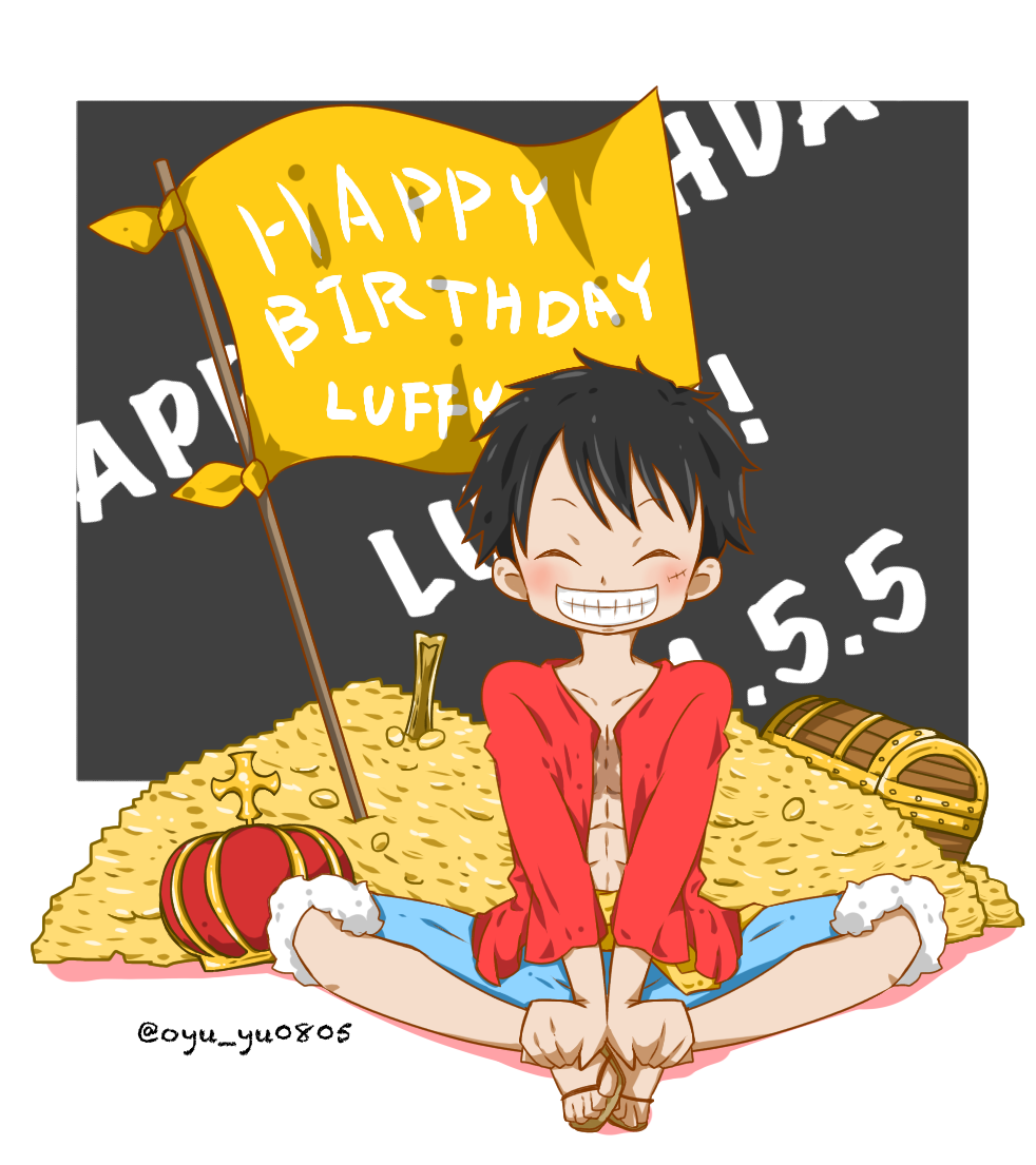 1boy abs black_hair blue_shorts clenched_teeth commentary dated full_body happy_birthday male_focus mikado85 monkey_d._luffy one_piece red_shirt sandals sash scar scar_on_face shirt short_hair shorts smile solo teeth yellow_sash