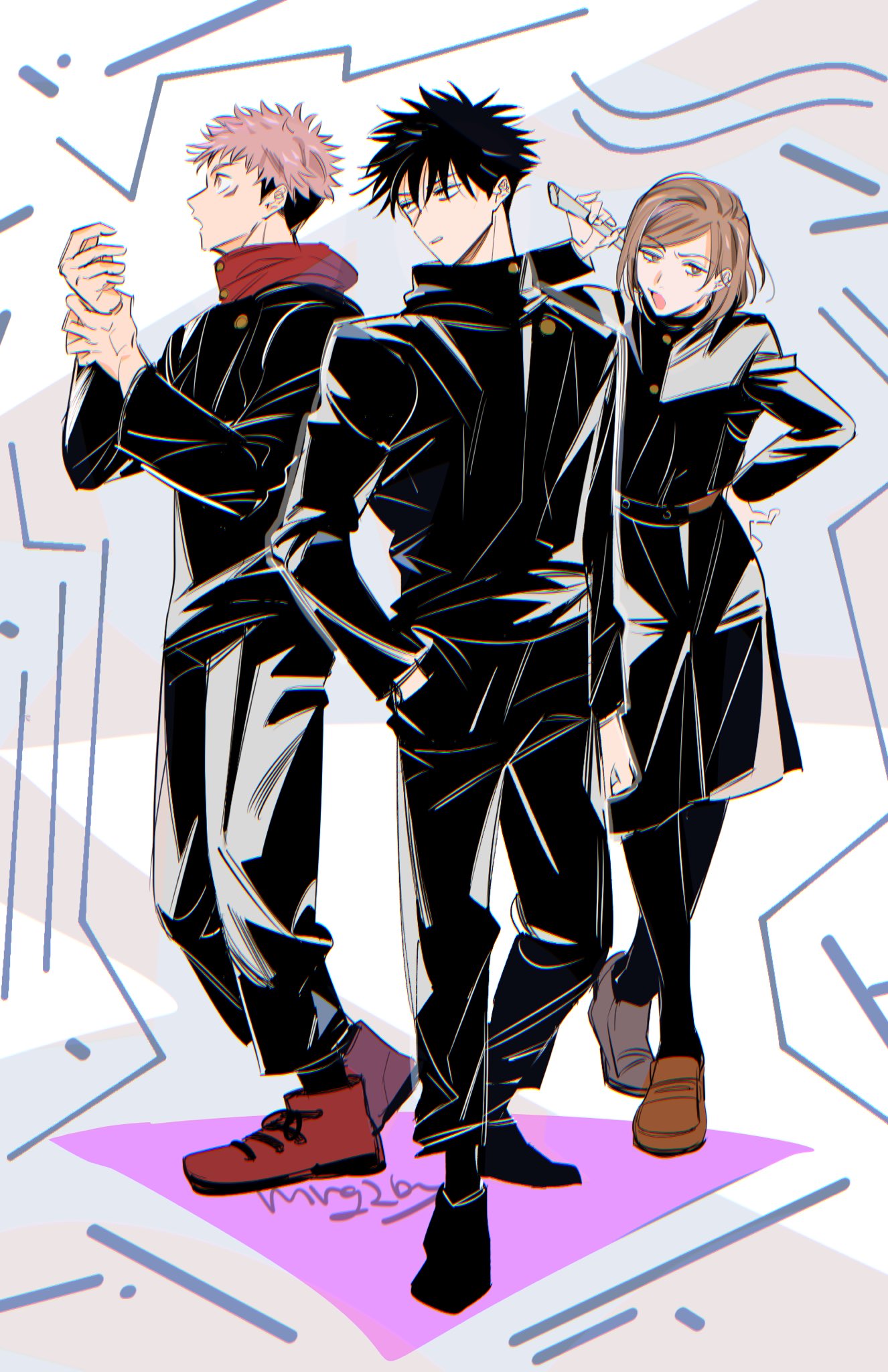 1girl 2boys black_hair black_jacket black_pants black_pantyhose brown_eyes brown_hair brown_shoes commentary_request full_body fushiguro_megumi hand_in_pocket hand_on_own_hip highres itadori_yuji jacket jujutsu_kaisen jujutsu_tech_uniform kugisaki_nobara looking_at_viewer looking_to_the_side mrg2by multiple_boys open_mouth pants pantyhose pink_hair shoes short_hair signature spiked_hair standing