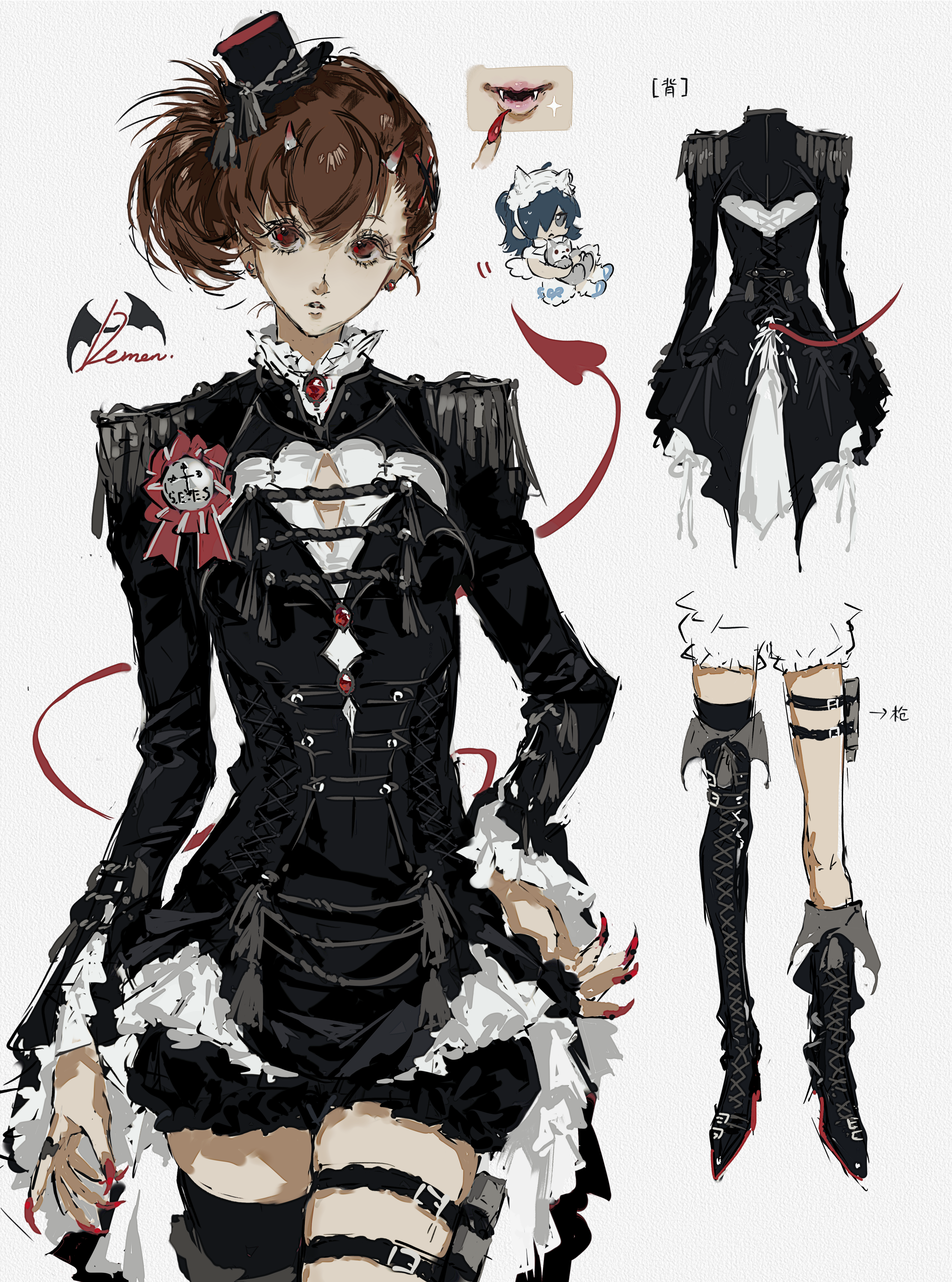 1girl absurdres aiguillette asymmetrical_footwear black_boots black_coat black_shirt black_shorts boots brown_hair chibi chibi_inset coat cowboy_shot demon_tail earrings epaulettes fangs fingernails frilled_shirt_collar frilled_sleeves frills hair_between_eyes hand_on_own_hip highres jewelry jing_zhi_kaoxiang_yu_re_zhong lace-up_boots long_fingernails long_sleeves looking_at_viewer medium_hair multiple_views ouji_fashion parted_lips persona persona_3 persona_3_portable puffy_shorts red_eyes red_nails red_ribbon ribbon shiomi_kotone shirt shorts side_ponytail simple_background skindentation tail tassel thigh_boots thigh_strap white_background yuuki_makoto_(persona_3)