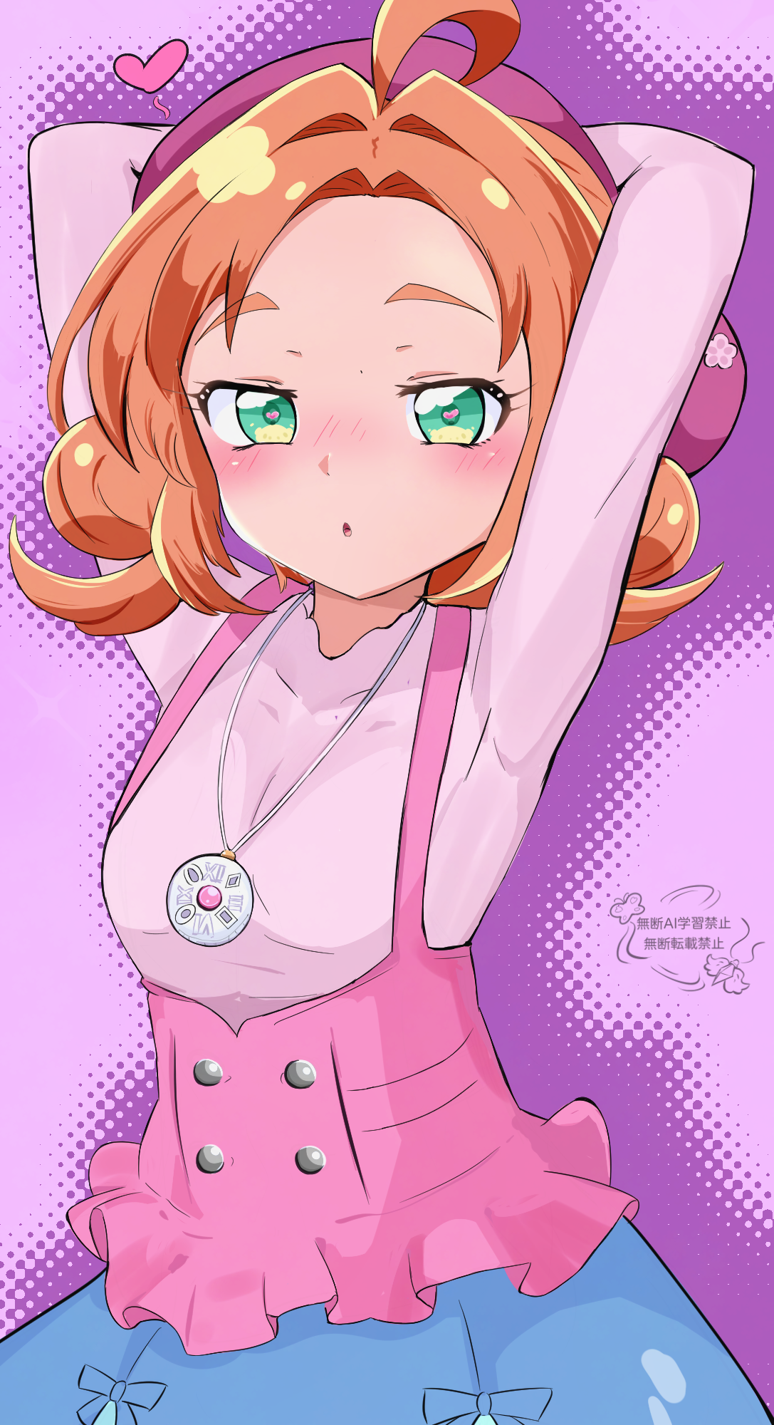 1girl ahoge akechi_anna arms_behind_head arms_up beret blouse blue_skirt blush commentary double_bun green_eyes hair_bun hair_intakes half-closed_eyes hat heart heart-shaped_pupils highres jewelry long_sleeves looking_at_viewer medium_hair meitantei_precure! necklace orange_hair pink_shirt precure purple_background purple_hat shirt short_twintails skirt solo standing symbol-shaped_pupils tenkiamesoda twintails upper_body