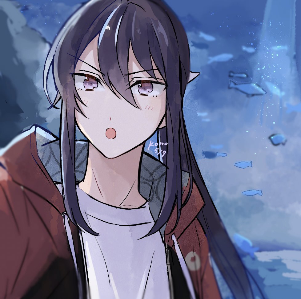 1boy aquarium commentary_request dated ensemble_stars! fish hair_between_eyes hood hood_down hooded_jacket jacket kanzaki_souma ko_no_ao long_hair looking_at_viewer male_focus open_mouth ponytail purple_eyes purple_hair red_jacket shirt signature solo straight_hair upper_body v-shaped_eyebrows white_shirt