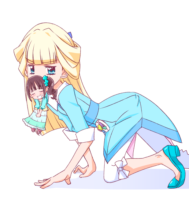 2girls all_fours anime_coloring aqua_skirt bag bag_bow blonde_hair blue_bow blue_dress blue_eyes blue_jacket blue_scrunchie blue_shoes bow brown_hair brown_shoes coattails collared_dress commentary_request contrast_collar dress eyelashes feral_instincts footwear_bow frilled_skirt frills furrowed_brow hair_bow hair_ornament hair_scrunchie hands_on_lap happy high_heels interlocked_fingers jacket long_hair long_skirt long_sleeves looking_at_viewer maboroshineko mini_person minigirl mouth_hold multicolored_bow multiple_girls nekoyashiki_mayu nekoyashiki_yuki nervous own_hands_clasped own_hands_together pants pink_bow possessive precure puffy_long_sleeves puffy_sleeves pumps scrunchie shadow shirt shoes short_dress side_ponytail simple_background size_difference skirt sleeve_cuffs straight_hair tailcoat three-quarter_sleeves very_long_hair waist_bag wavy_hair white_background white_bag white_bow white_pants wonderful_precure! yellow_shirt