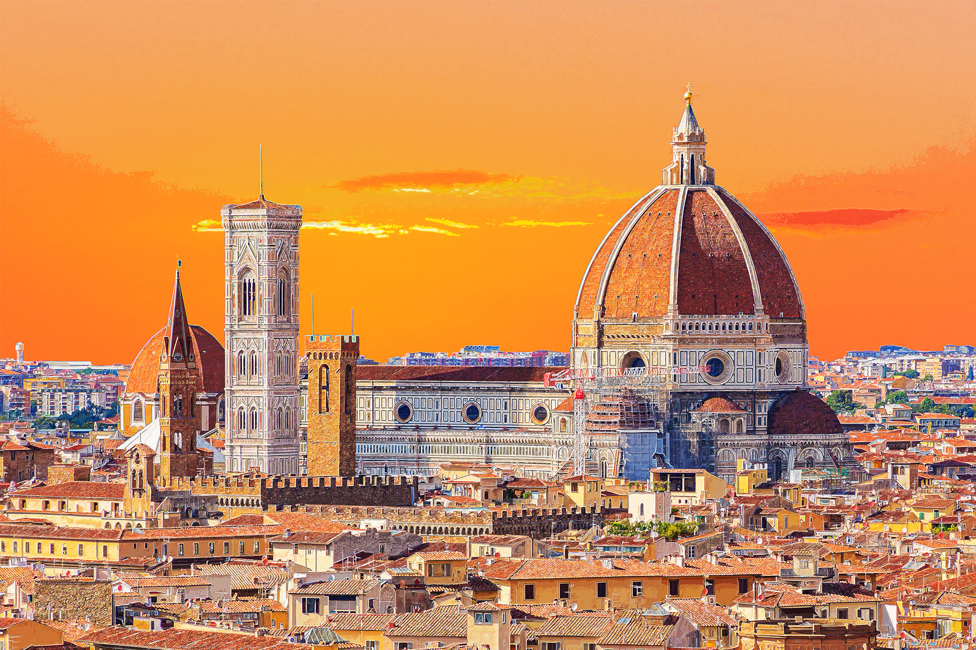 anuchartl architecture city cityscape cloud commentary cupola_(building) dome english_commentary european_architecture evening florence_(city) florence_cathedral highres italy no_humans orange_sky original outdoors photorealistic real_world_location realistic scenery sky spire tower