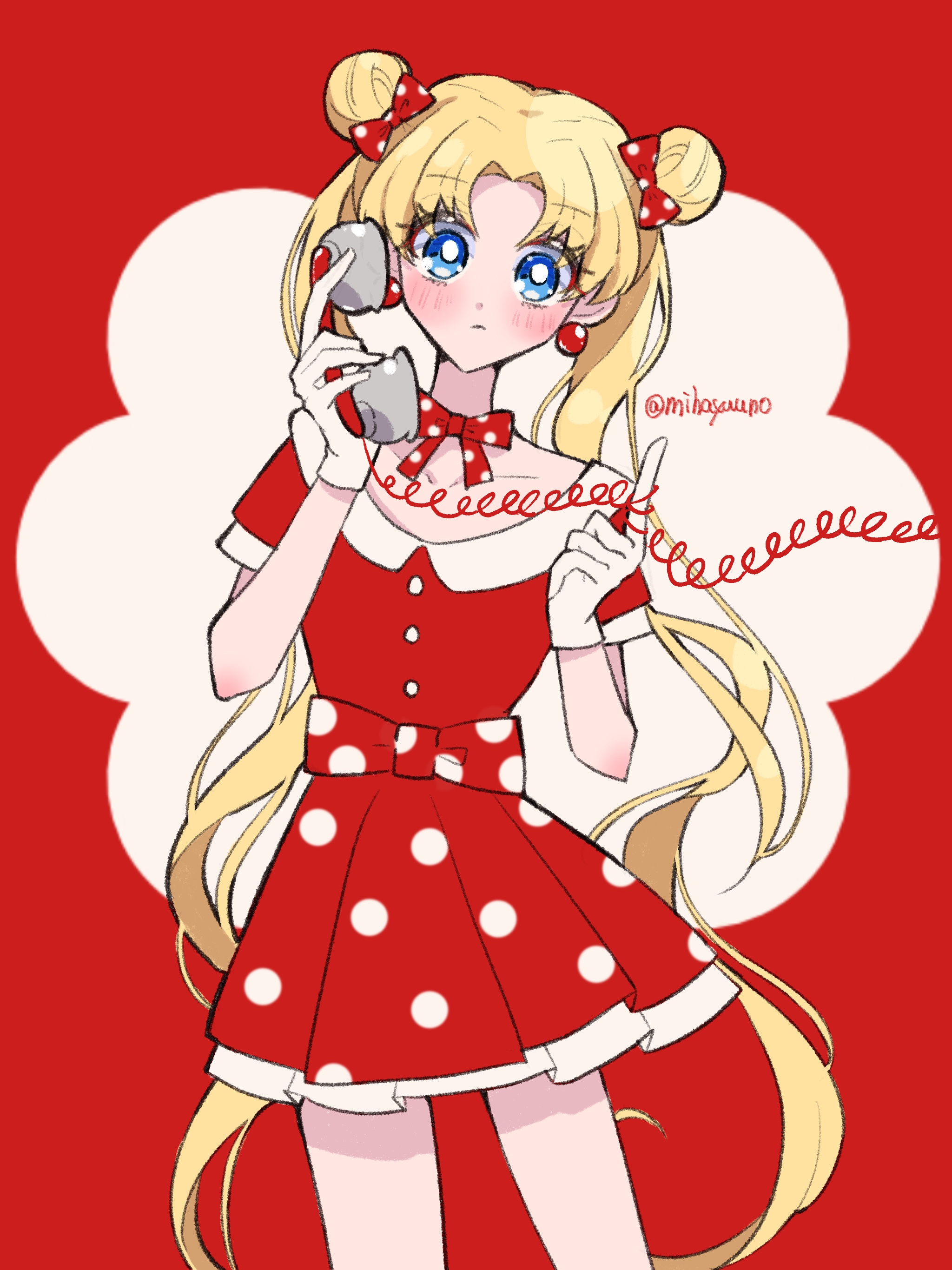 1girl absurdly_long_hair absurdres anime_coloring bare_arms bishoujo_senshi_sailor_moon blonde_hair blue_eyes bow bow_choker bowtie bright_pupils choker closed_mouth collarbone commentary_request corded_phone cowboy_shot dot_nose double_bun dress earrings expressionless eyelashes eyes_visible_through_hair gloves hair_bow hair_bun highres holding holding_phone jewelry light_blush light_frown long_hair mihayuuno parted_bangs phone pleated_dress polka_dot polka_dot_bow polka_dot_bowtie polka_dot_dress red_background red_bow red_bowtie red_dress red_theme short_dress short_sleeves solo sphere_earrings standing talking_on_phone tareme thighs tsukino_usagi twintails twitter_username two-tone_background very_long_hair waist_bow wavy_hair white_background white_gloves white_pupils