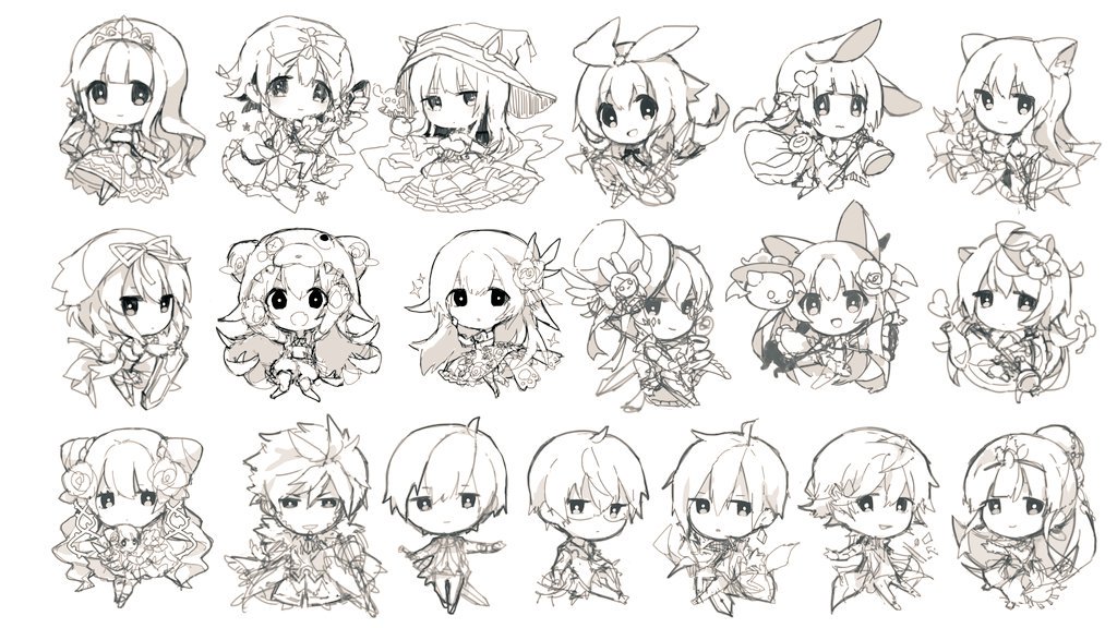 6+boys 6+girls az_9649 chibi full_body greyscale grimms_notes monochrome multiple_boys multiple_girls simple_background white_background