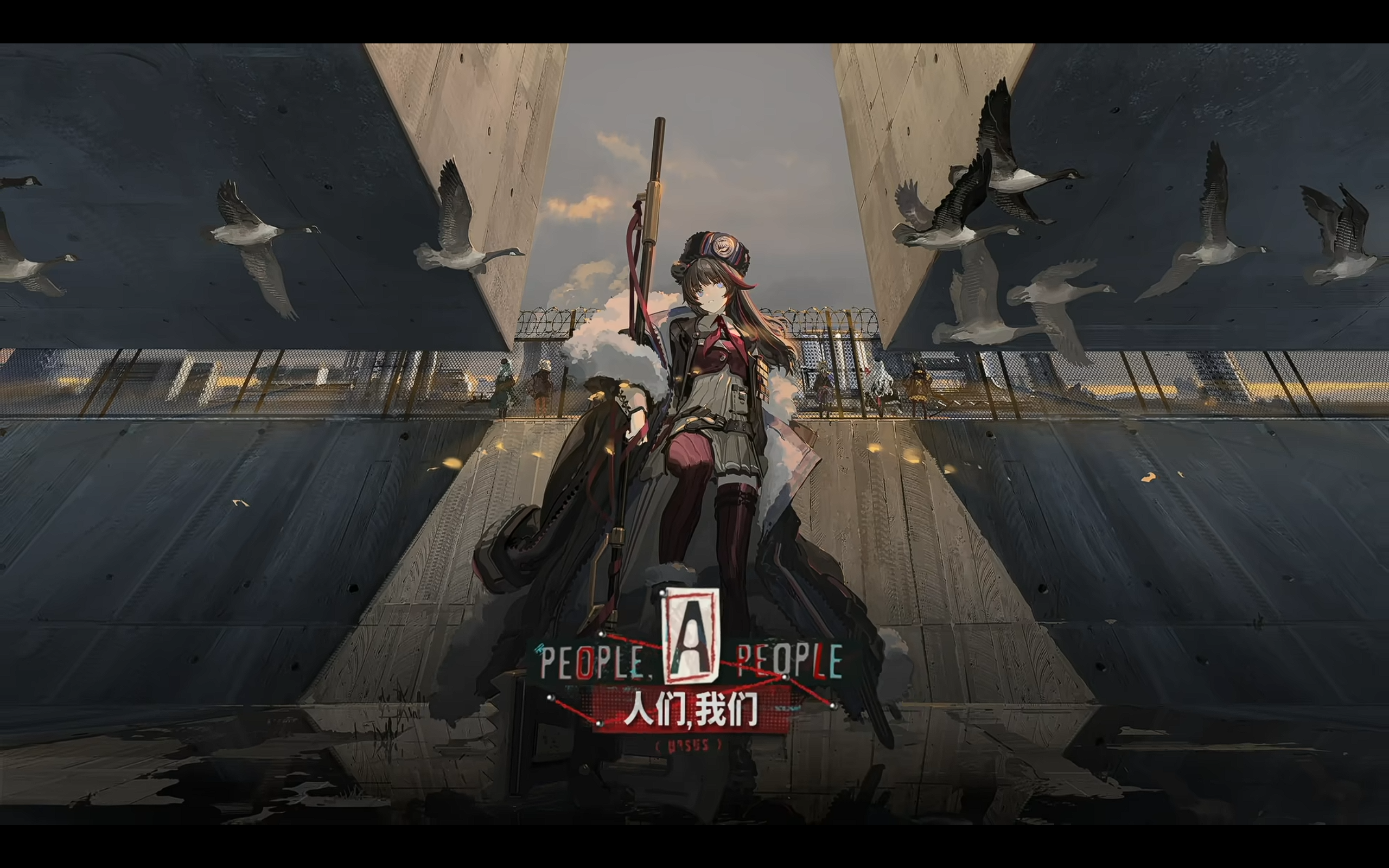 6+girls animal_ears arknights azling badge barbed_wire bear_ears belt bird black_hat brown_hair brown_jacket building chinese_text cloud cloudy_sky concrete concrete_wall fence flying from_below gummy_(arknights) hat highres holding holding_weapon istina_(arknights) jacket leto_(arknights) logo long_hair long_sleeves multicolored_hair multiple_girls neckerchief official_art oversized_clothes oversized_jacket puffy_collar puffy_sleeve_cuffs red_neckerchief red_ribbon red_socks red_streaks ribbon rosa_(arknights) sky socks standing streaked_hair thighhighs ushanka weapon wire_fence zettai_ryouiki zima_(arknights)