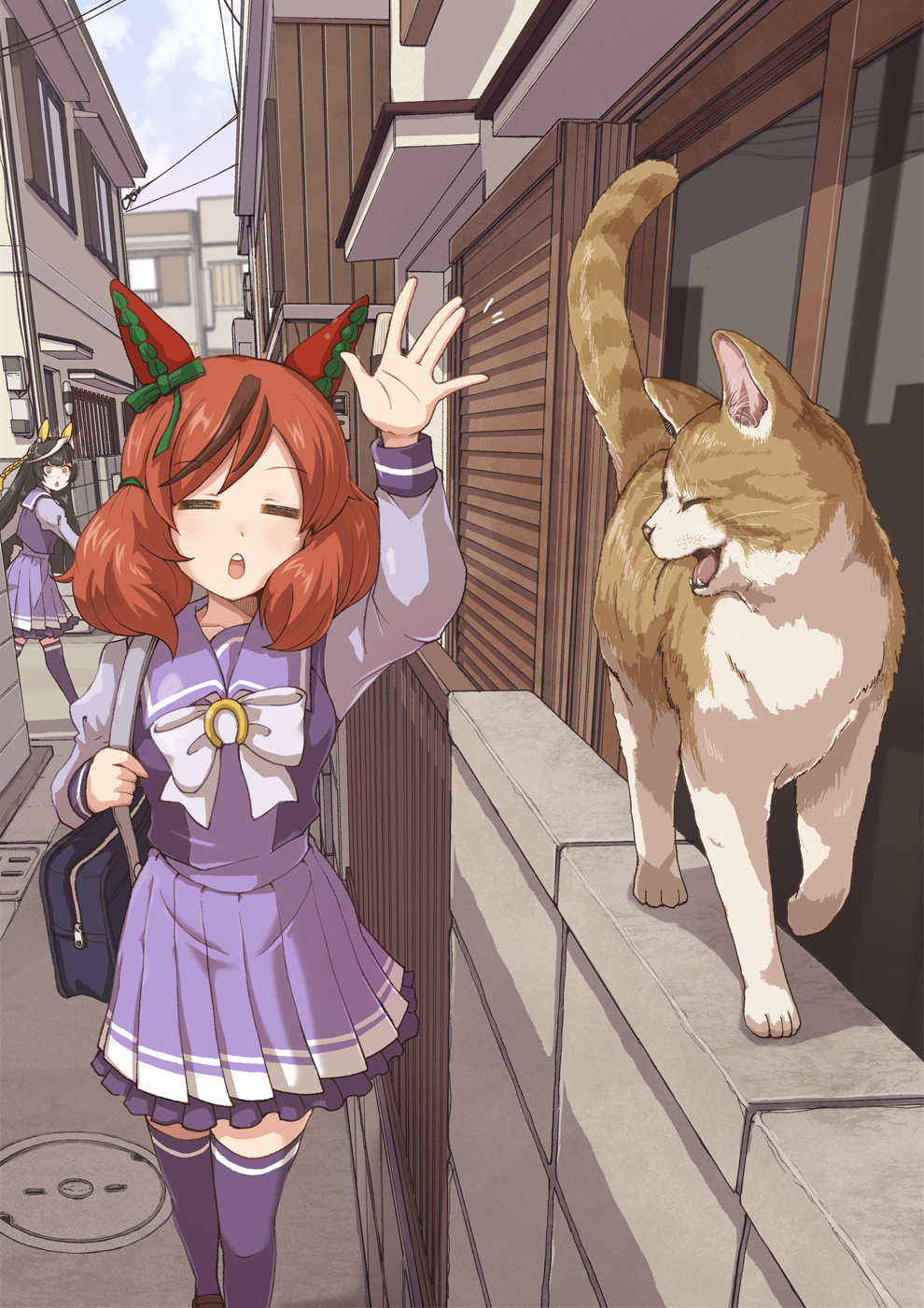 2girls ahoge alley animal_ears bag black_hair blunt_bangs blush bow bowtie breasts brown_hair calstone_light_o_(umamusume) cat closed_eyes cloud ear_bow ear_covers ear_ribbon green_bow highres hime_cut horse_ears horse_girl horse_tail house long_hair long_sleeves medium_hair multicolored_hair multiple_girls nice_nature_(umamusume) open_mouth outdoors pleated_skirt power_lines pronghorn purple_sailor_collar purple_serafuku purple_shirt purple_skirt purple_thighhighs sailor_collar sailor_shirt satomura_kyou school_bag school_uniform serafuku shirt skirt sky streaked_hair tail teeth thighhighs tracen_school_uniform twintails umamusume upper_teeth_only white_bow white_bowtie white_hair yellow_eyes