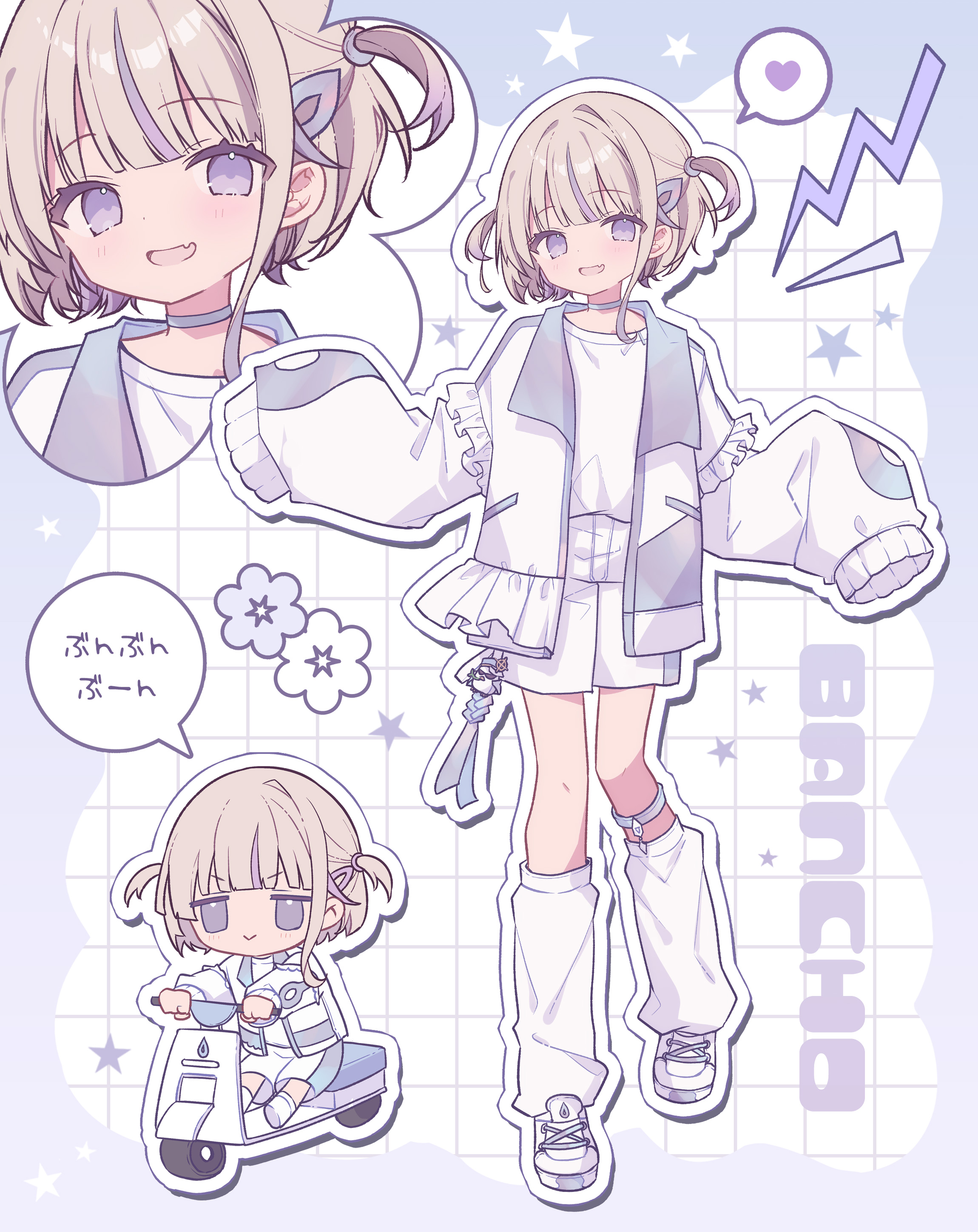1girl :d absurdres brown_hair driving fang hair_ornament hairclip heart highres hololive hololive_dev_is jacket kurun_(kurun777) lightning_bolt_symbol long_sleeves loose_socks moped motor_vehicle multicolored_hair multiple_views open_clothes open_jacket open_mouth outline puffy_long_sleeves puffy_sleeves purple_eyes purple_hair shirt shoes shorts sleeves_past_fingers sleeves_past_wrists smile socks spoken_heart star_(symbol) streaked_hair todoroki_hajime two_side_up virtual_youtuber white_jacket white_outline white_shirt white_shoes white_shorts white_socks