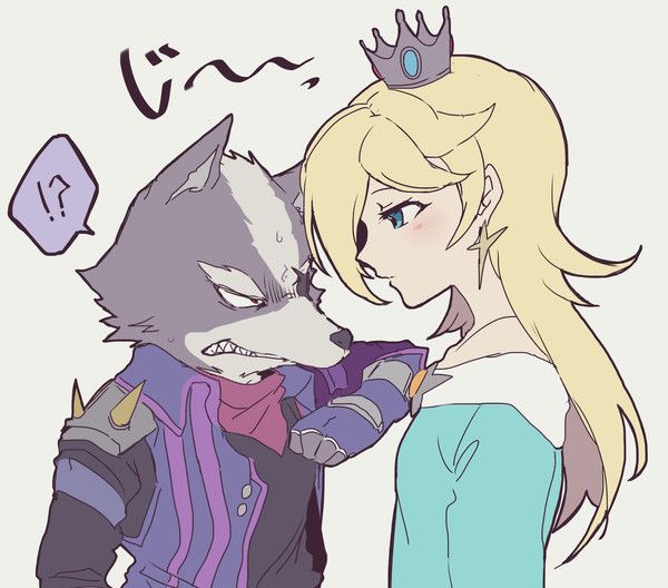 ! 1boy 1girl ? animal_ears blonde_hair blue_dress clenched_teeth commentary dress earrings english_commentary fangs furry furry_male grey_fur jewelry looking_at_another lylatspace mario_(series) nintendo purple_vest rosalina shoulder_spikes silver_crown speech_bubble spikes spoken_exclamation_mark spoken_question_mark star_(symbol) star_earrings star_fox super_mario_galaxy sweatdrop teeth vest wolf_boy wolf_ears wolf_o'donnell