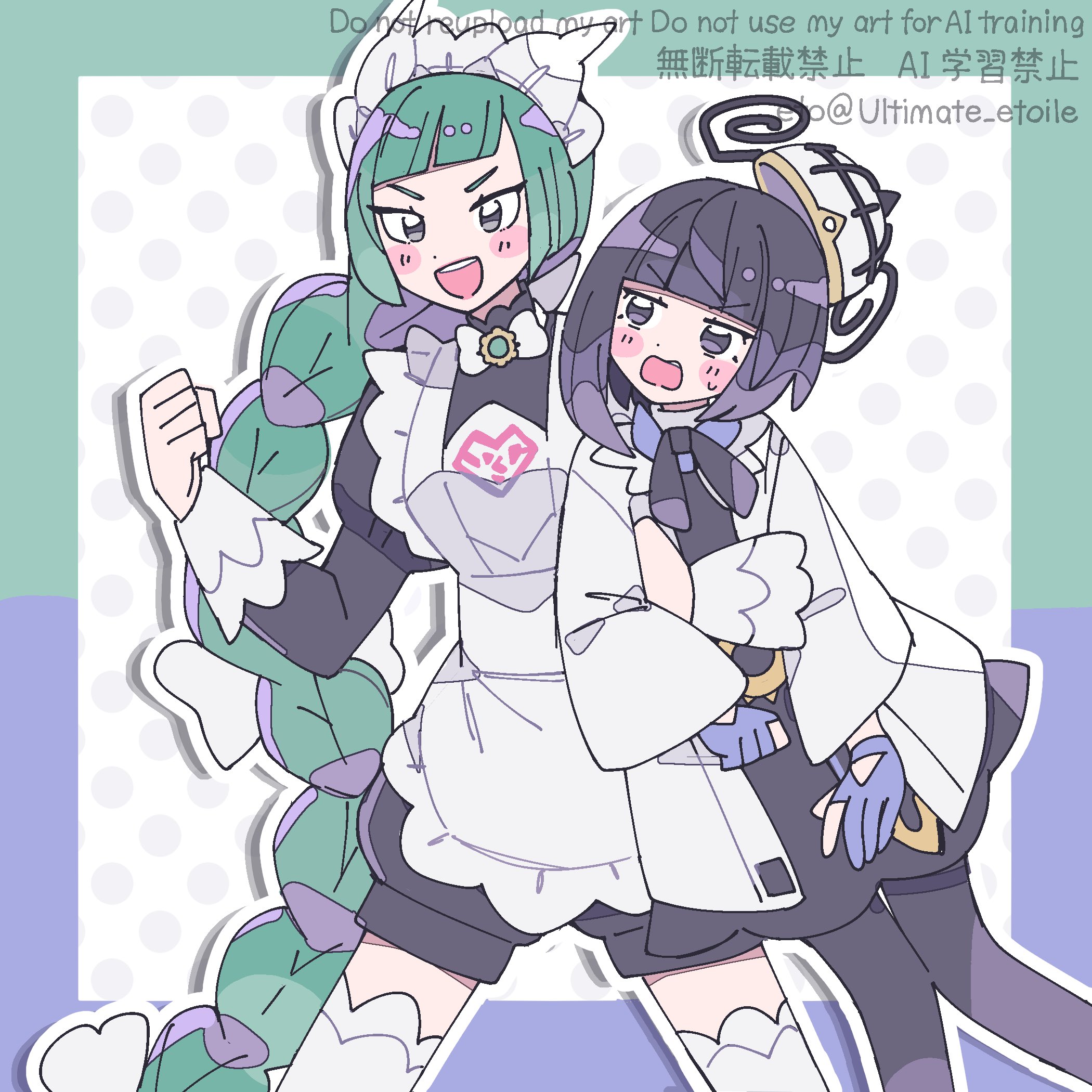 2girls apron black_dress black_romper blunt_bangs braid dress gloves green_hair gwynn_(pokemon) highres lebanne_(pokemon) long_hair low-braided_long_hair low-tied_long_hair multiple_girls nintendo pokemon pokemon_legends:_z-a purple_gloves purple_hair remoooon romper thighhighs watermark white_apron white_thighhighs