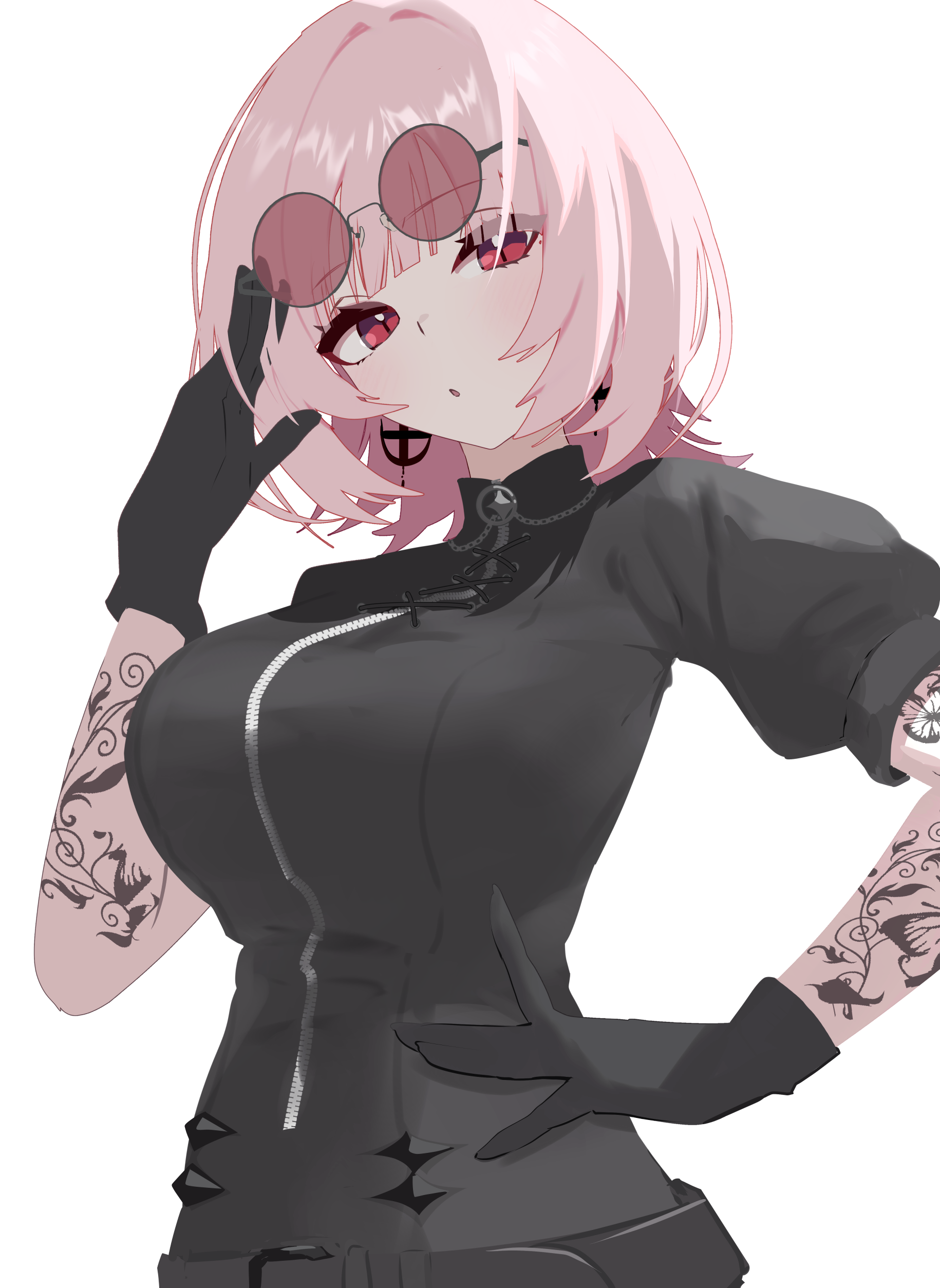 1girl absurdres arm_tattoo black_gloves black_hood black_streaks breasts eyewear_on_head gloves hand_on_own_hip highres hololive hololive_english long_sidelocks looking_at_viewer mori_calliope mori_calliope_(ferrywoman) multicolored_hair numzawa official_alternate_hairstyle pink_hair red_eyes round_eyewear short_hair sidelocks solo streaked_hair sunglasses tattoo upper_body virtual_youtuber white_background